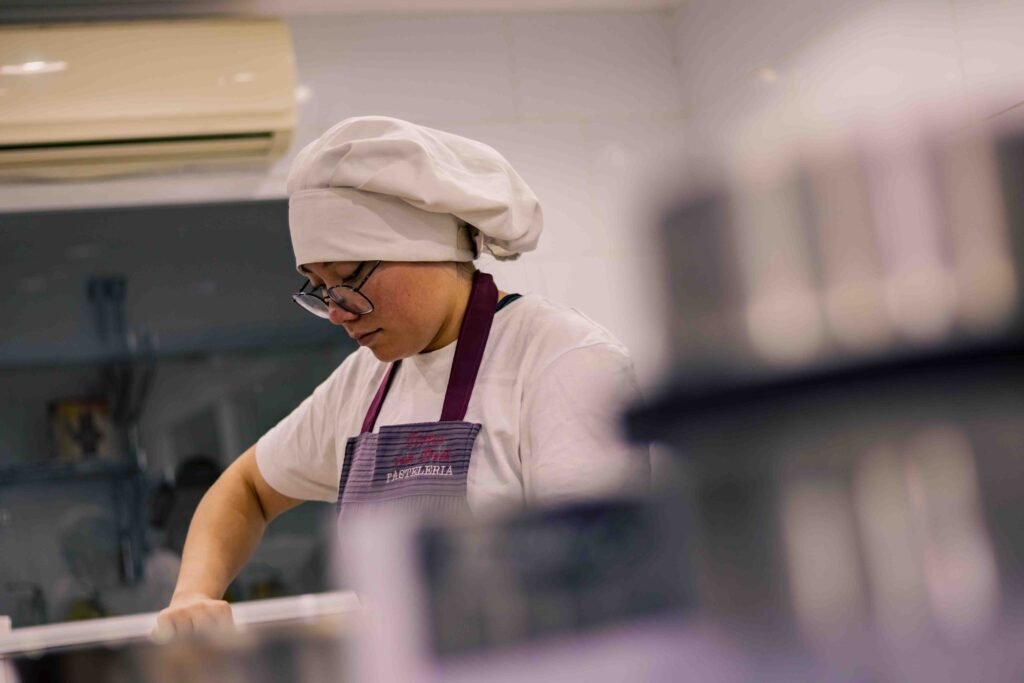 El proceso es 100% hecho a mano, dependiente de la técnica, precisión y experiencia de nuestras maestras pasteleras. La producción comienza desde cero: quebramos uno a uno los huevos para separar claras y yemas. Luego batimos con azúcar, incorporando aire para lograr una textura ligera, a la que posteriormente añadimos los ingredientes secos y las materias grasas.