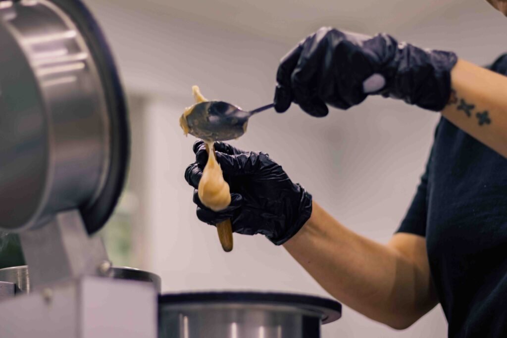 Tras 24 horas, la mezcla ha integrado completamente sus componentes y está lista para su cocción en una prensa que supera los 220°C. A partir de aquí, el proceso exige máxima atención al detalle, técnica y coordinación para controlar porción, tiempo, temperatura y rapidez en cada movimiento.