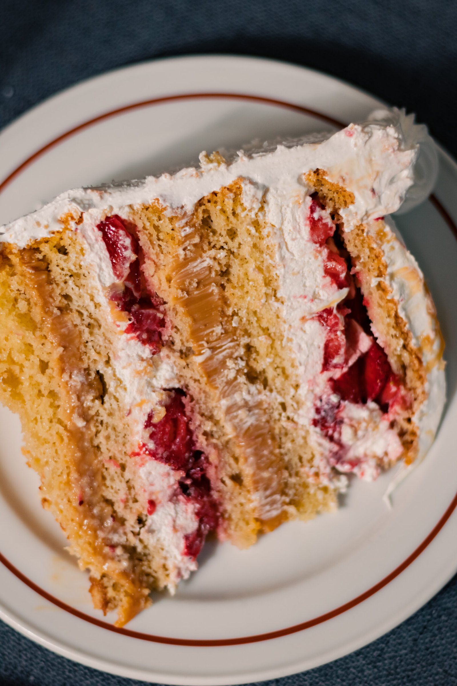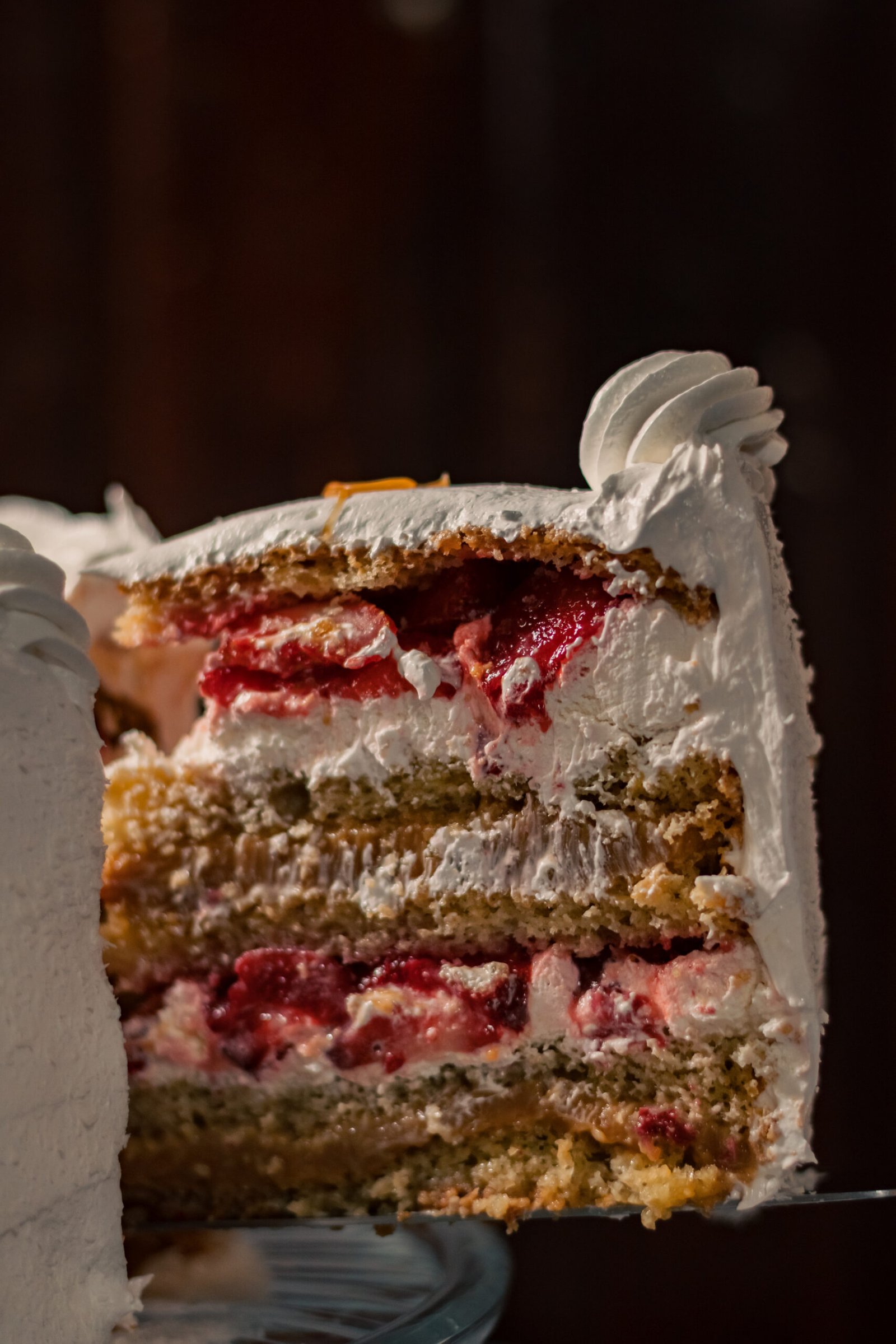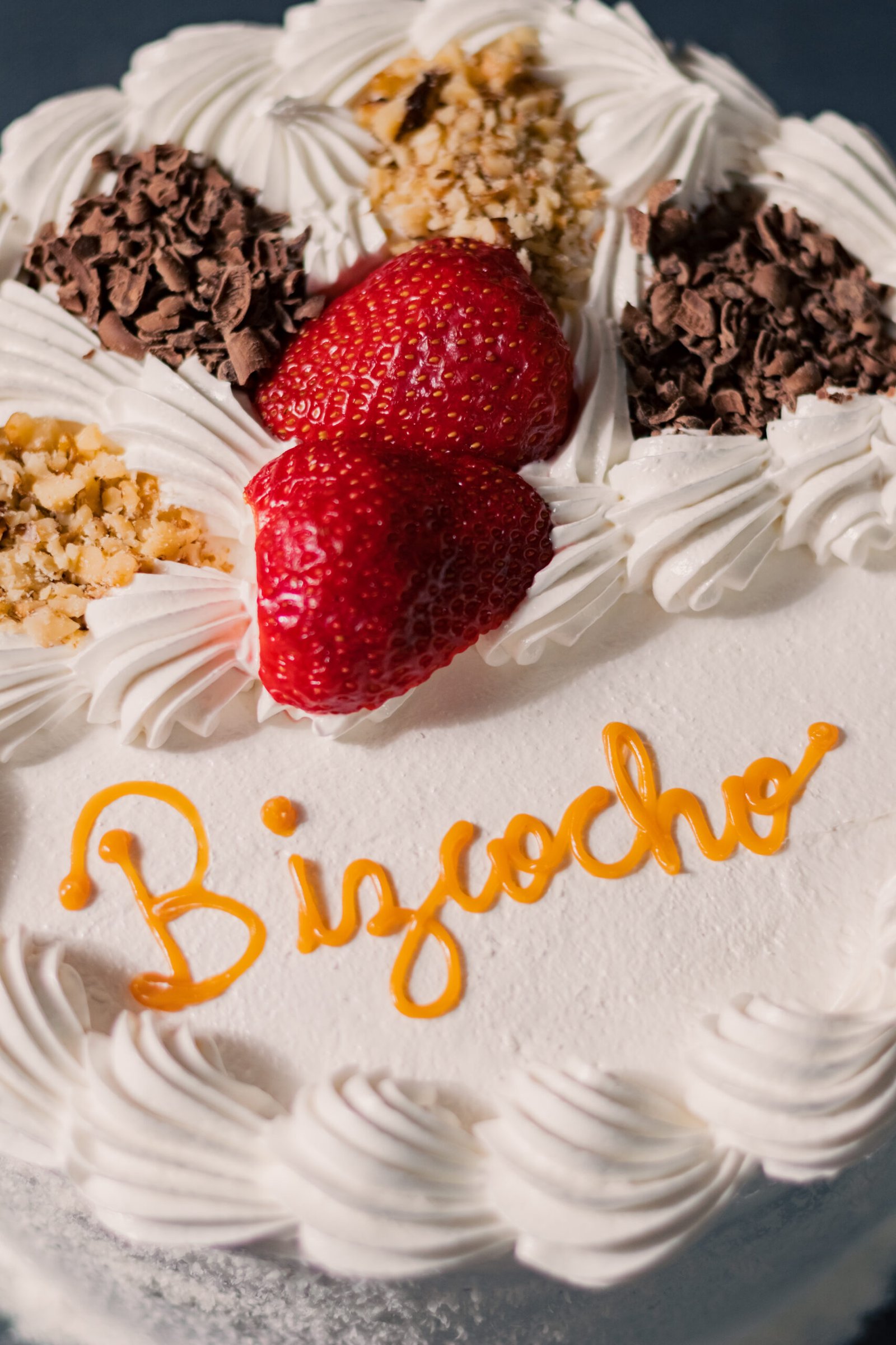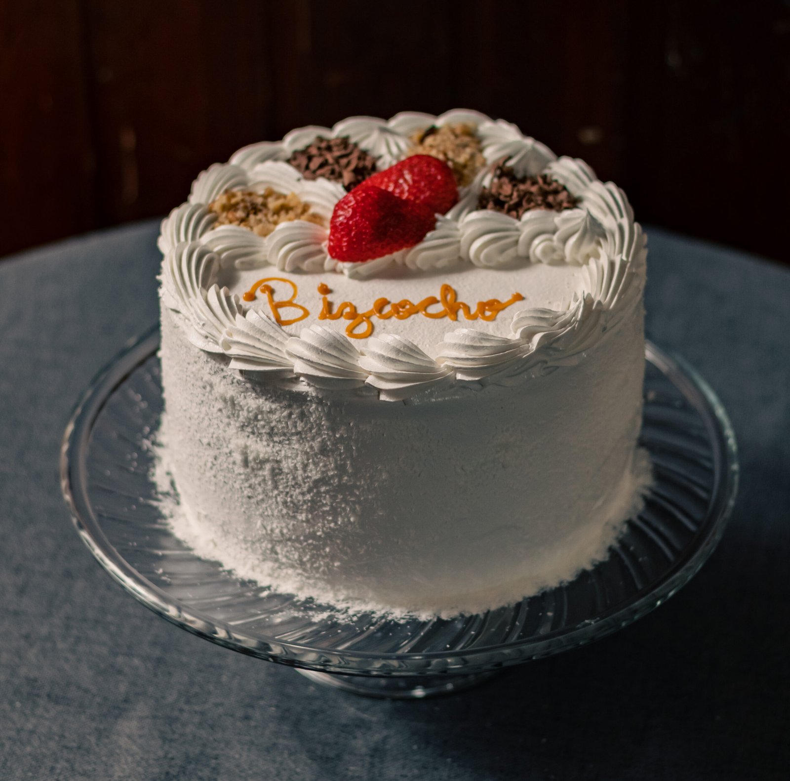 Queque de bizcoho blanco relleno de manjar y crema chantillí y trozos de frutillas naturales. Cubierta de merengue italiano, coco rayado por el costado y decorada con chocolate y frutos secos picados.