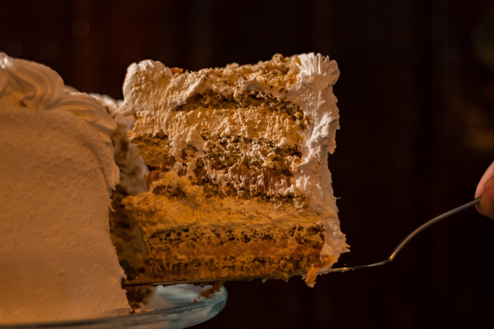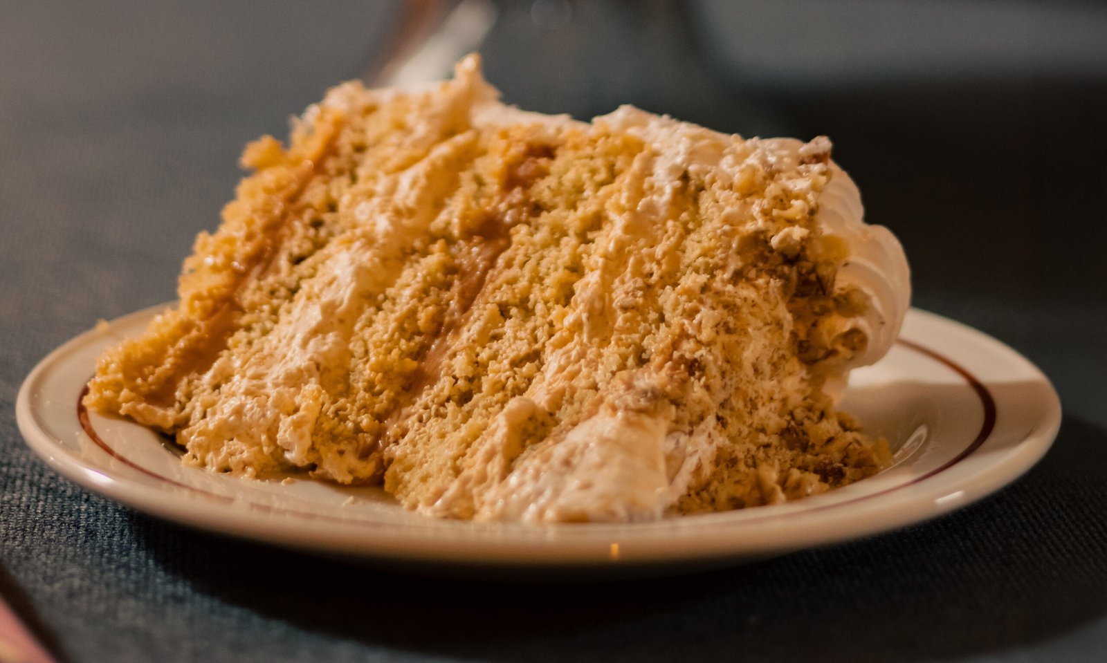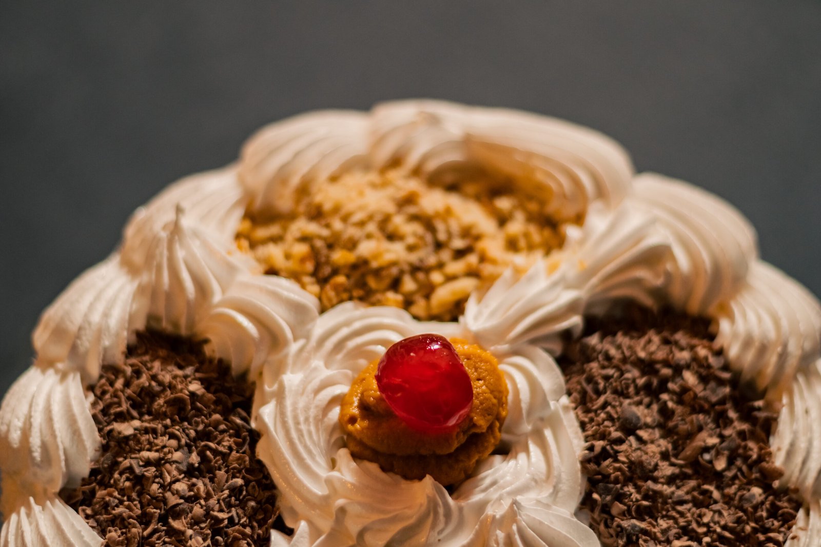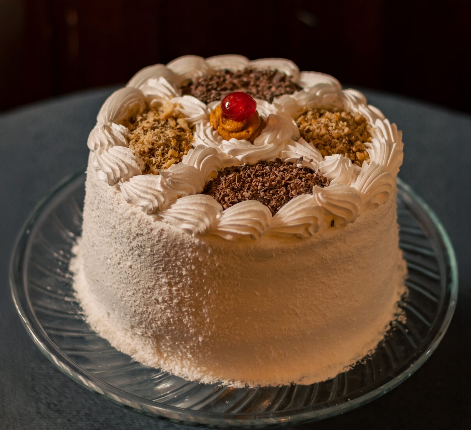 Queque de bizcoho blanco relleno de manjar y crema chantillí con pasta de lúcuma. Cubierta de merengue italiano, coco rayado por el costado y decorada con chocolate y frutos secos picados.