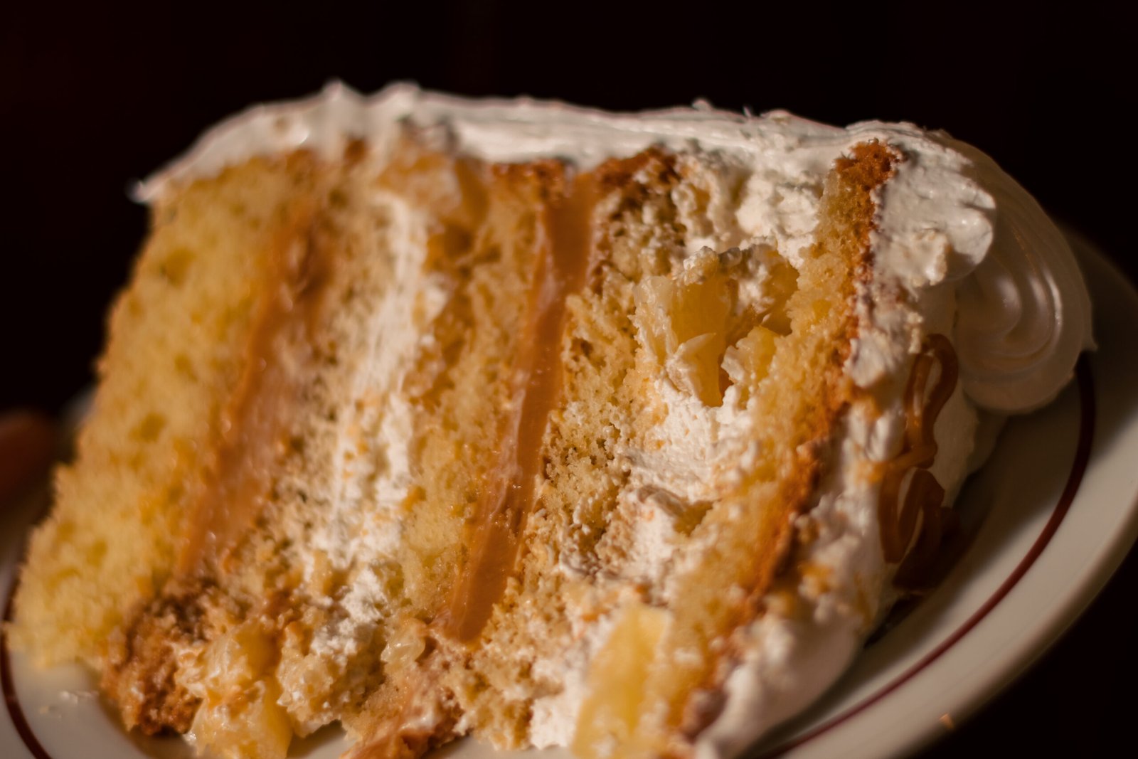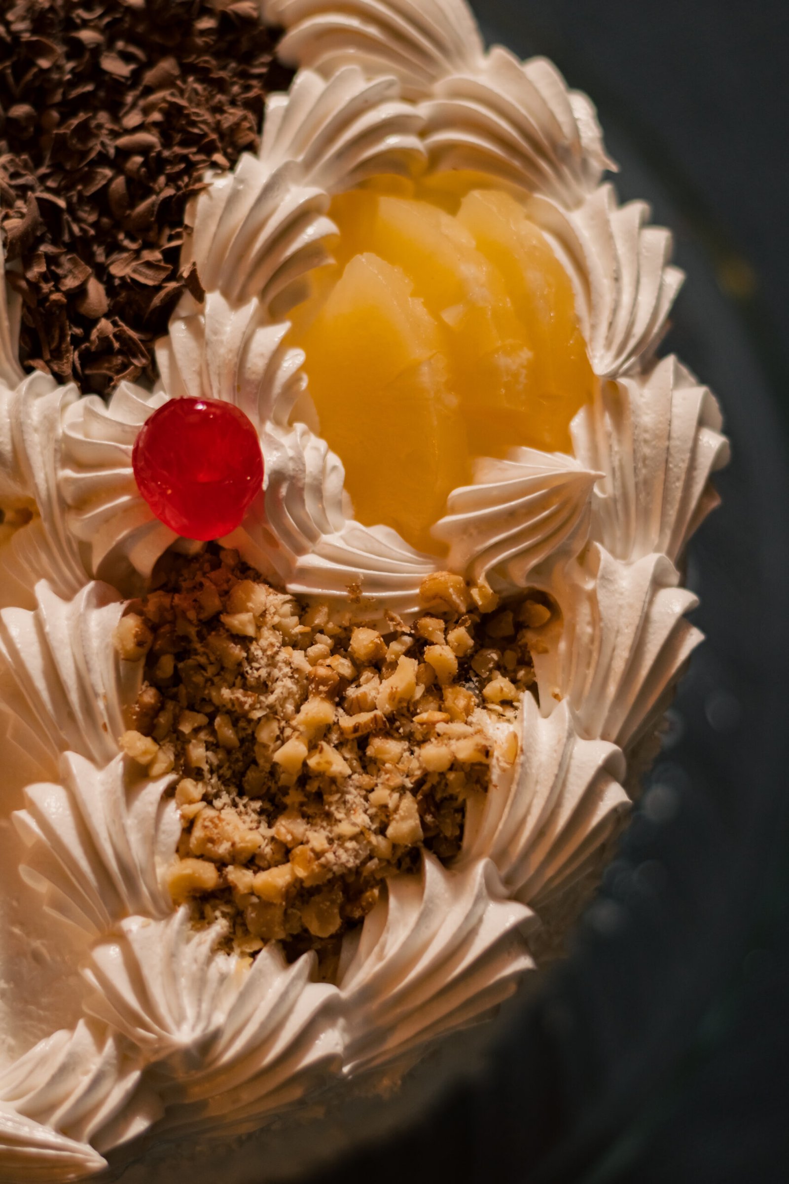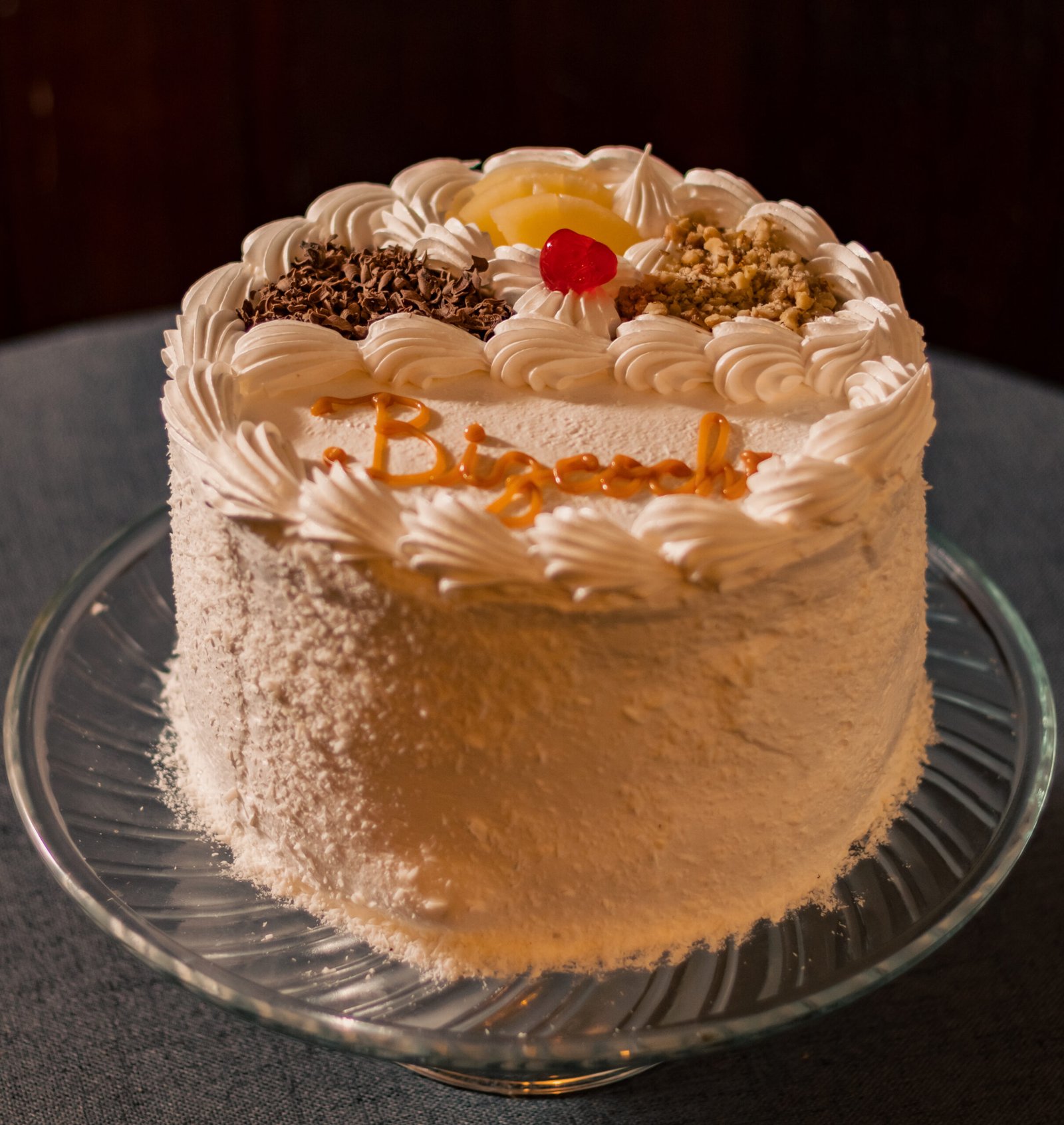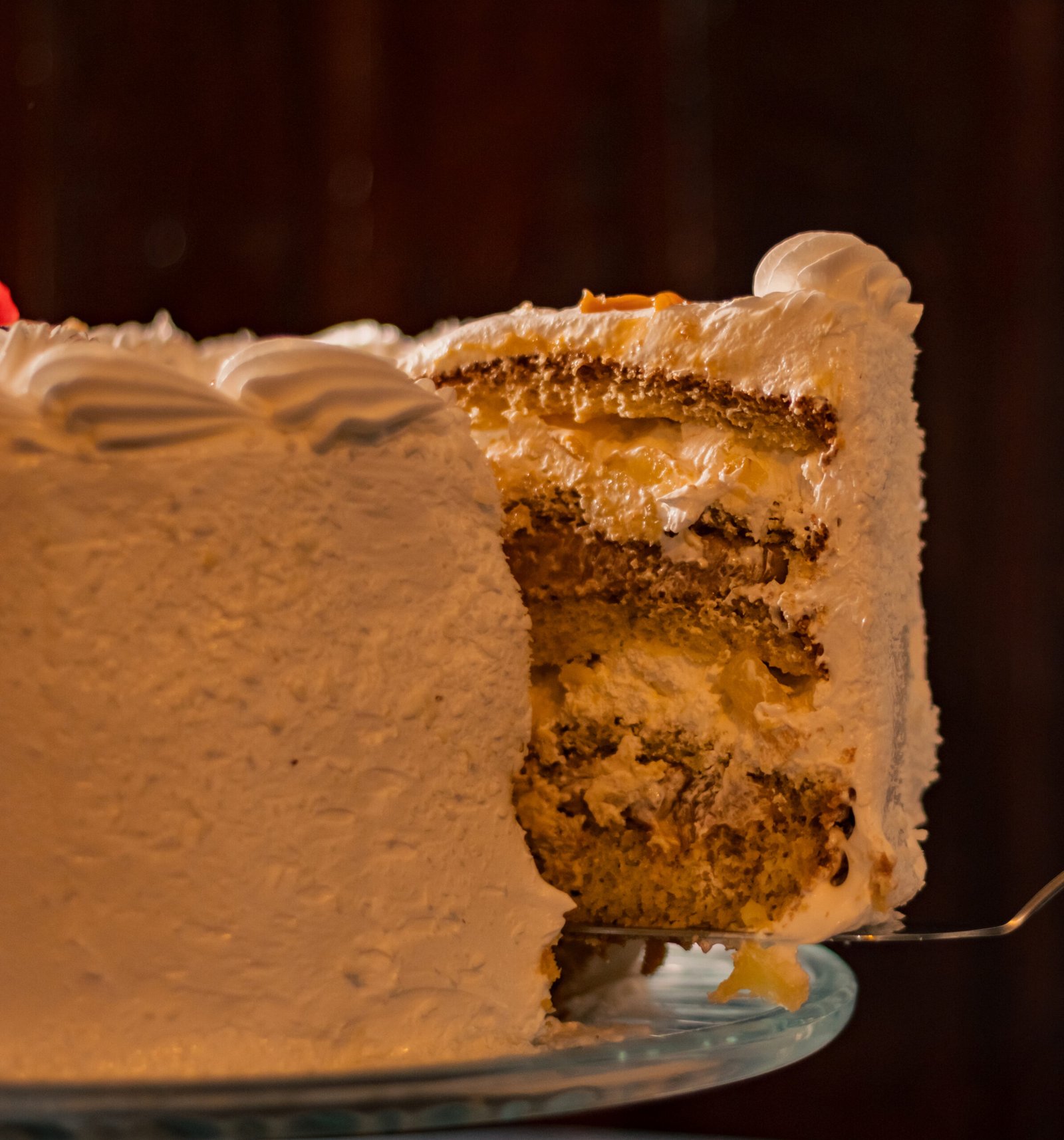 Queque de bizcoho blanco relleno de manjar y crema chantillí con trozos de piña. Cubierta de merengue italiano, coco rayado por el costado y decorada con chocolate y frutos secos picados.