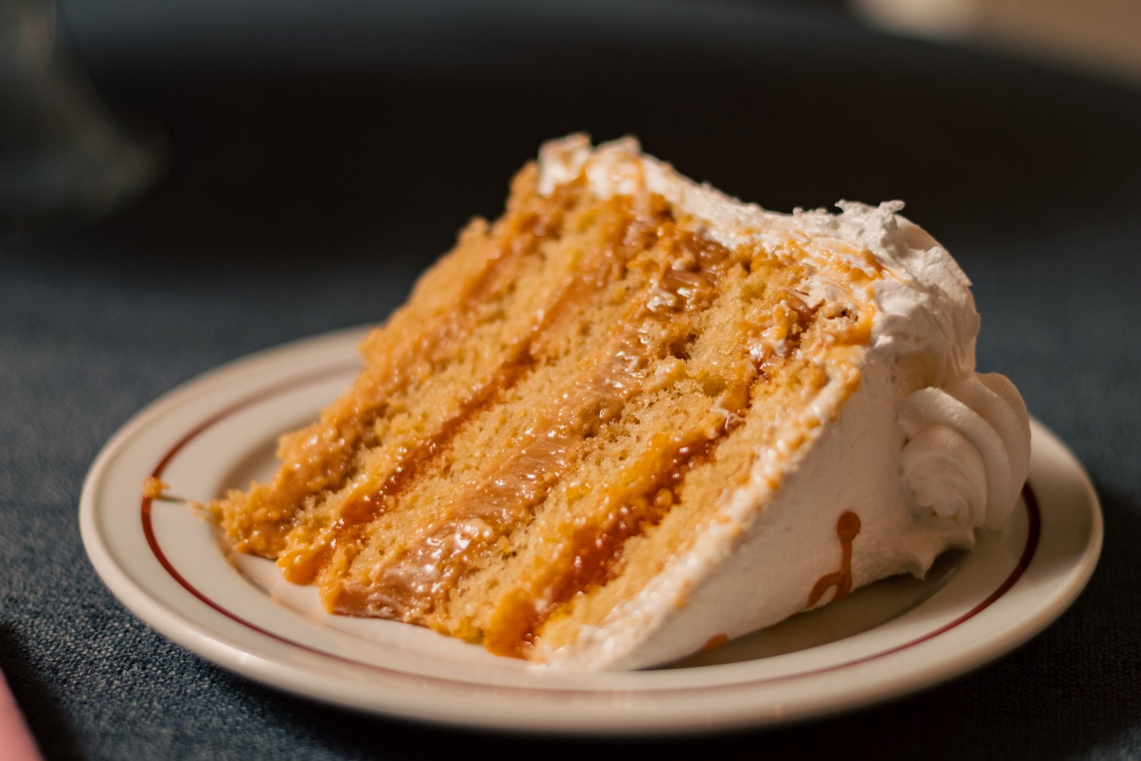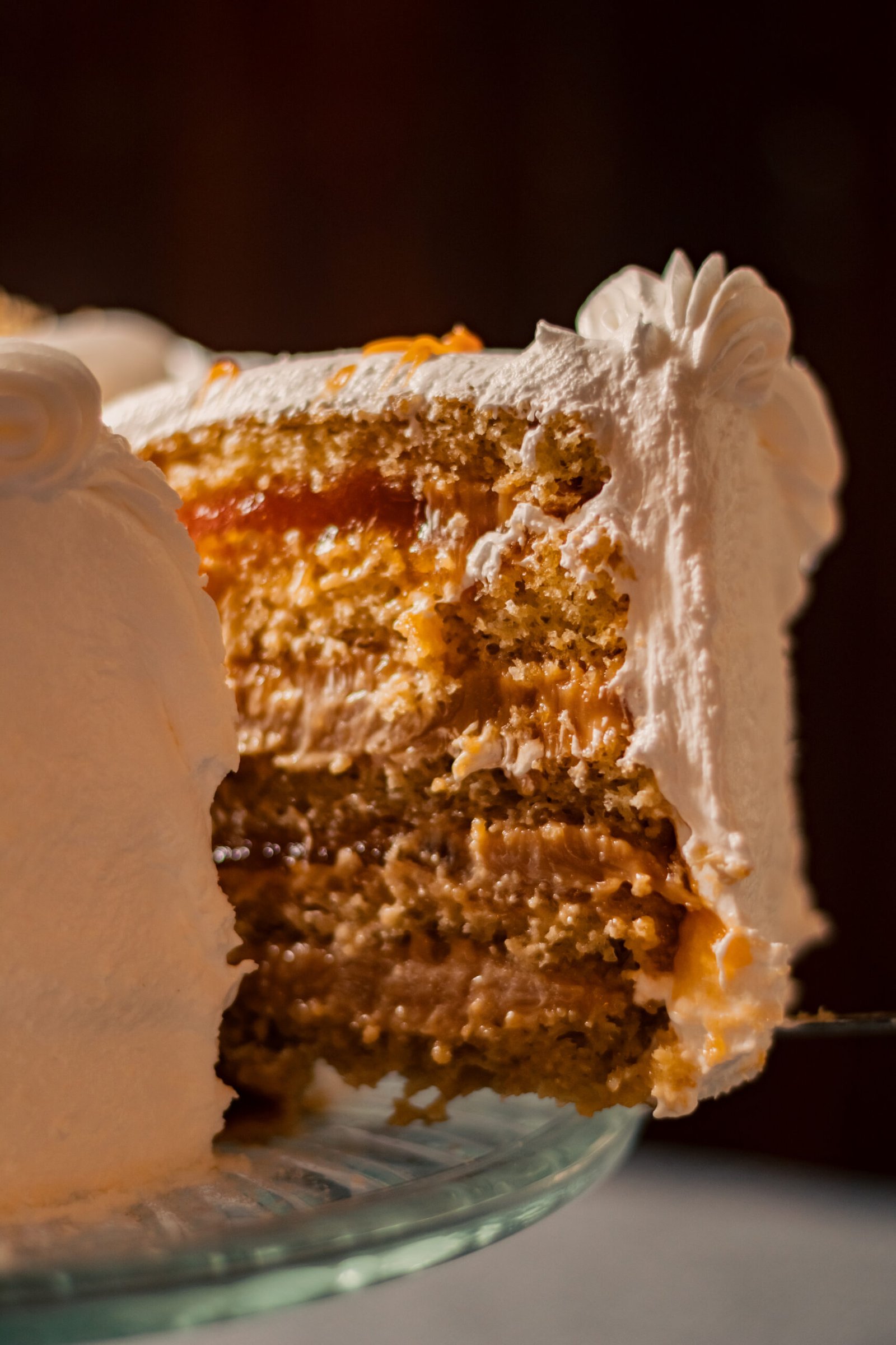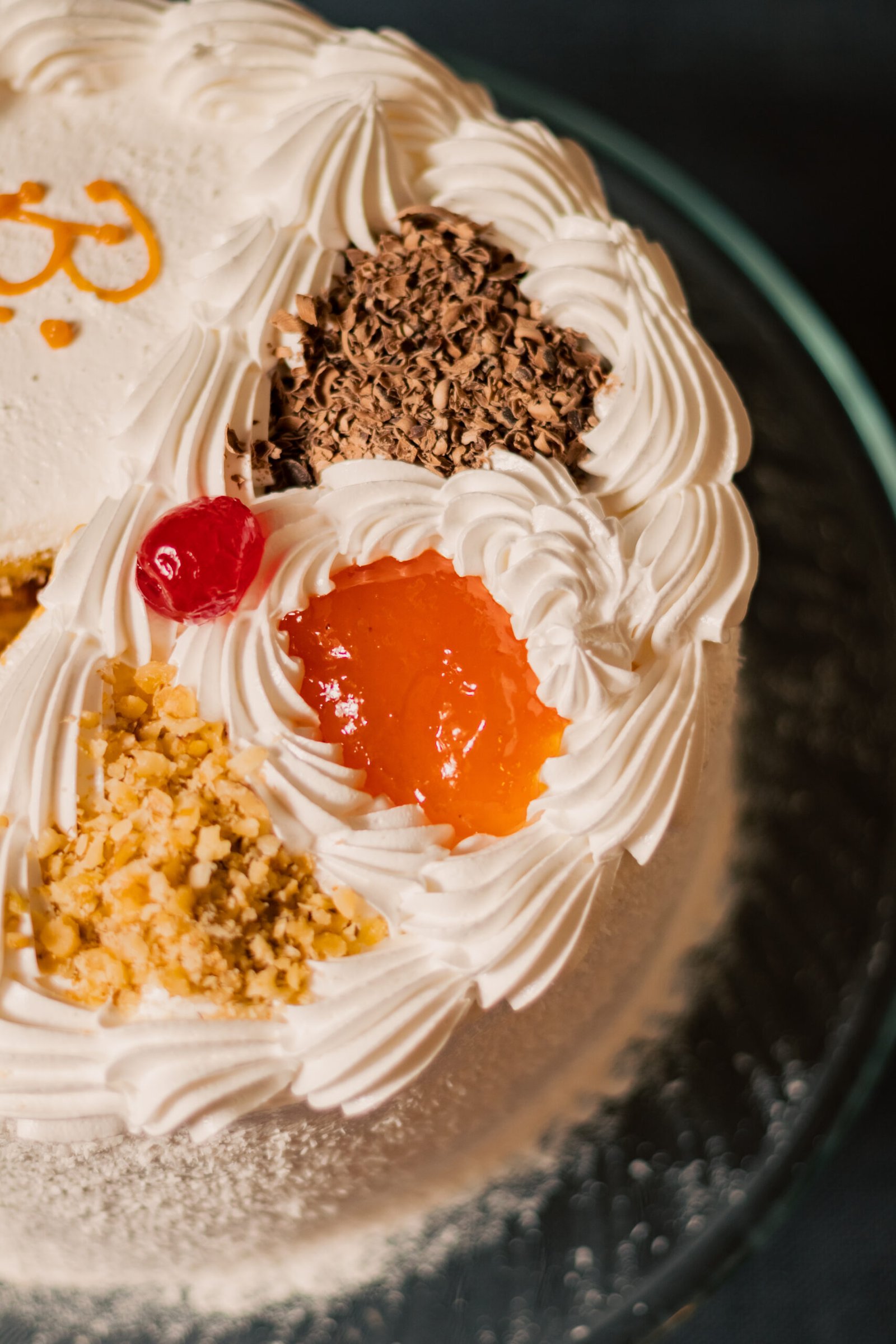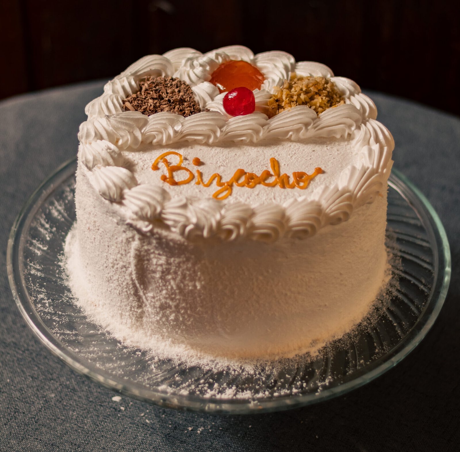 Queque de bizcoho blanco relleno de manjar y mermelada de damascos. Cubierta de merengue italiano, coco rayado por el costado y decorada con chocolate y frutos secos picados.