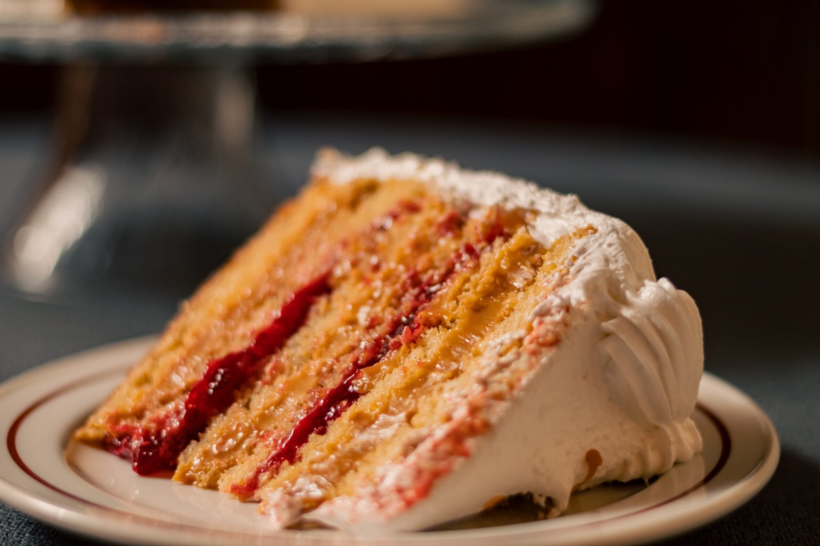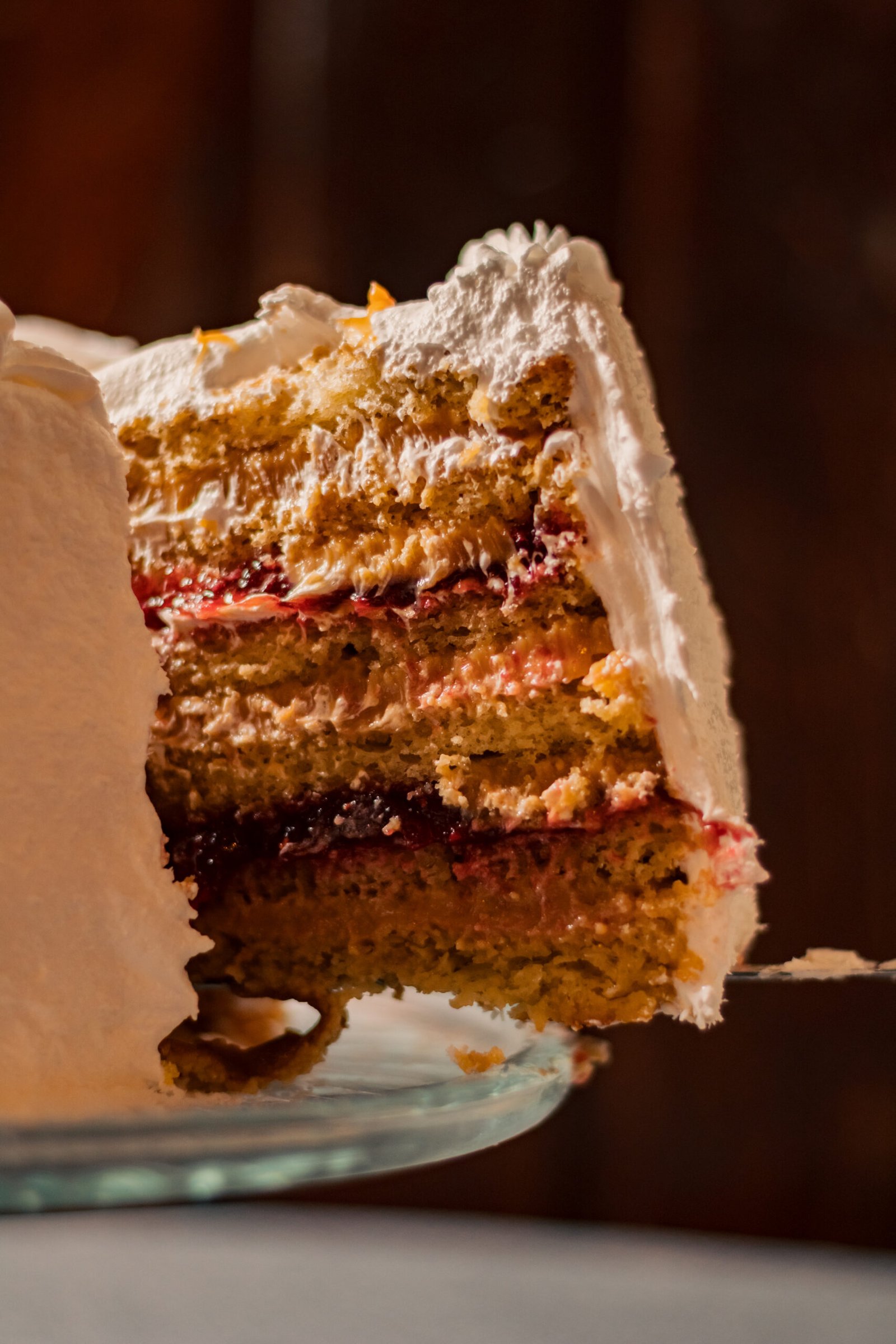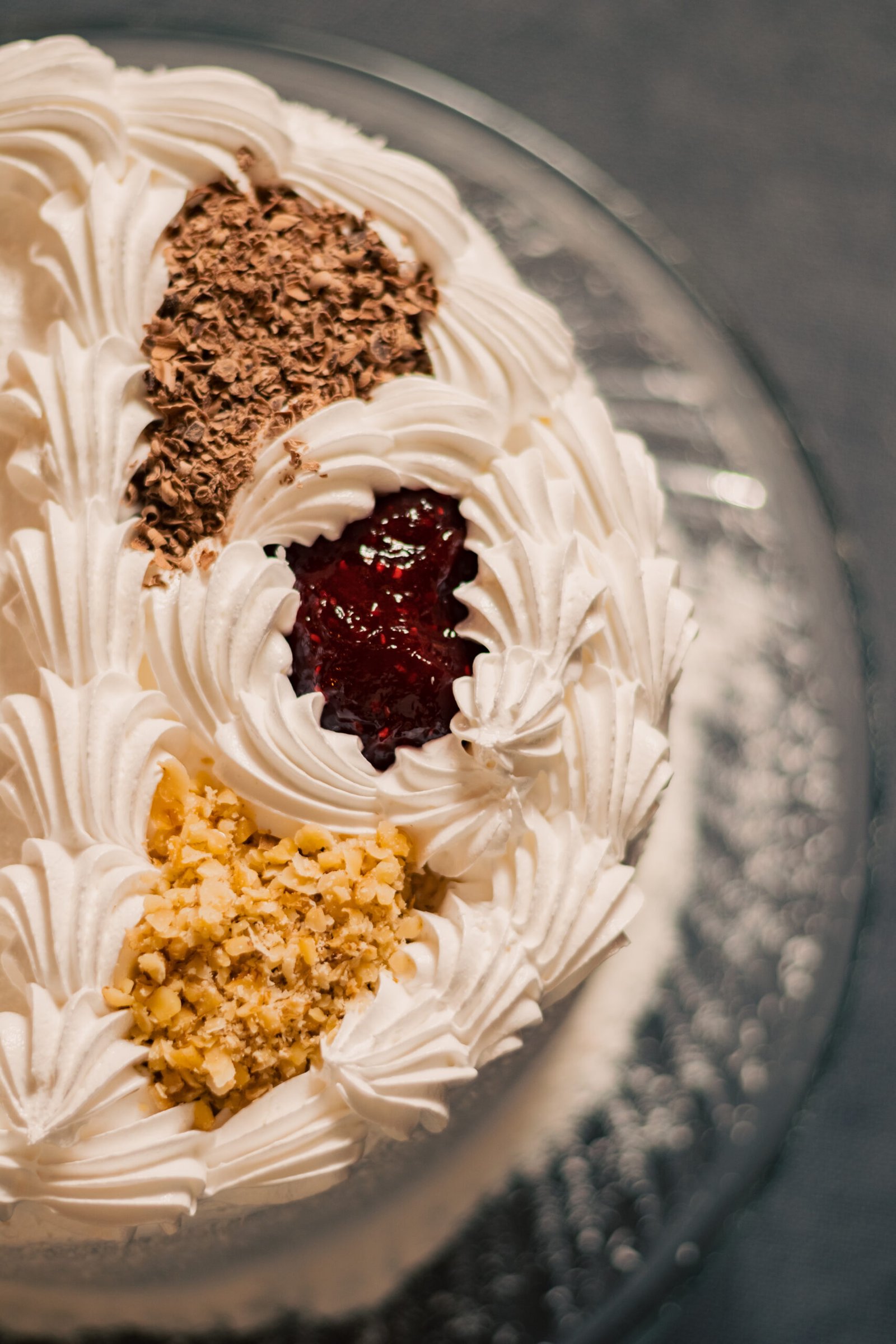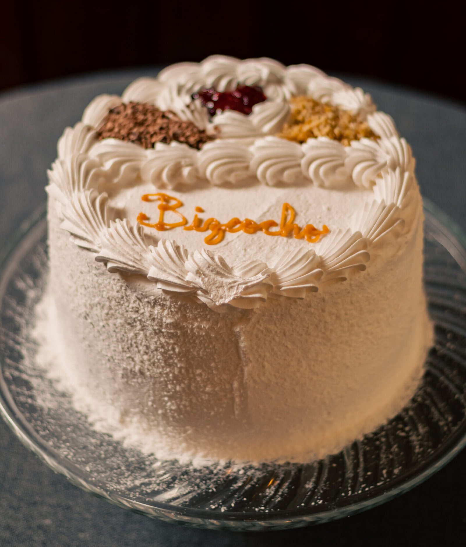 Queque de bizcoho blanco relleno de manjar y mermelada de frambuesas. Cubierta de merengue italiano, coco rayado por el costado y decorada con chocolate y frutos secos picados.