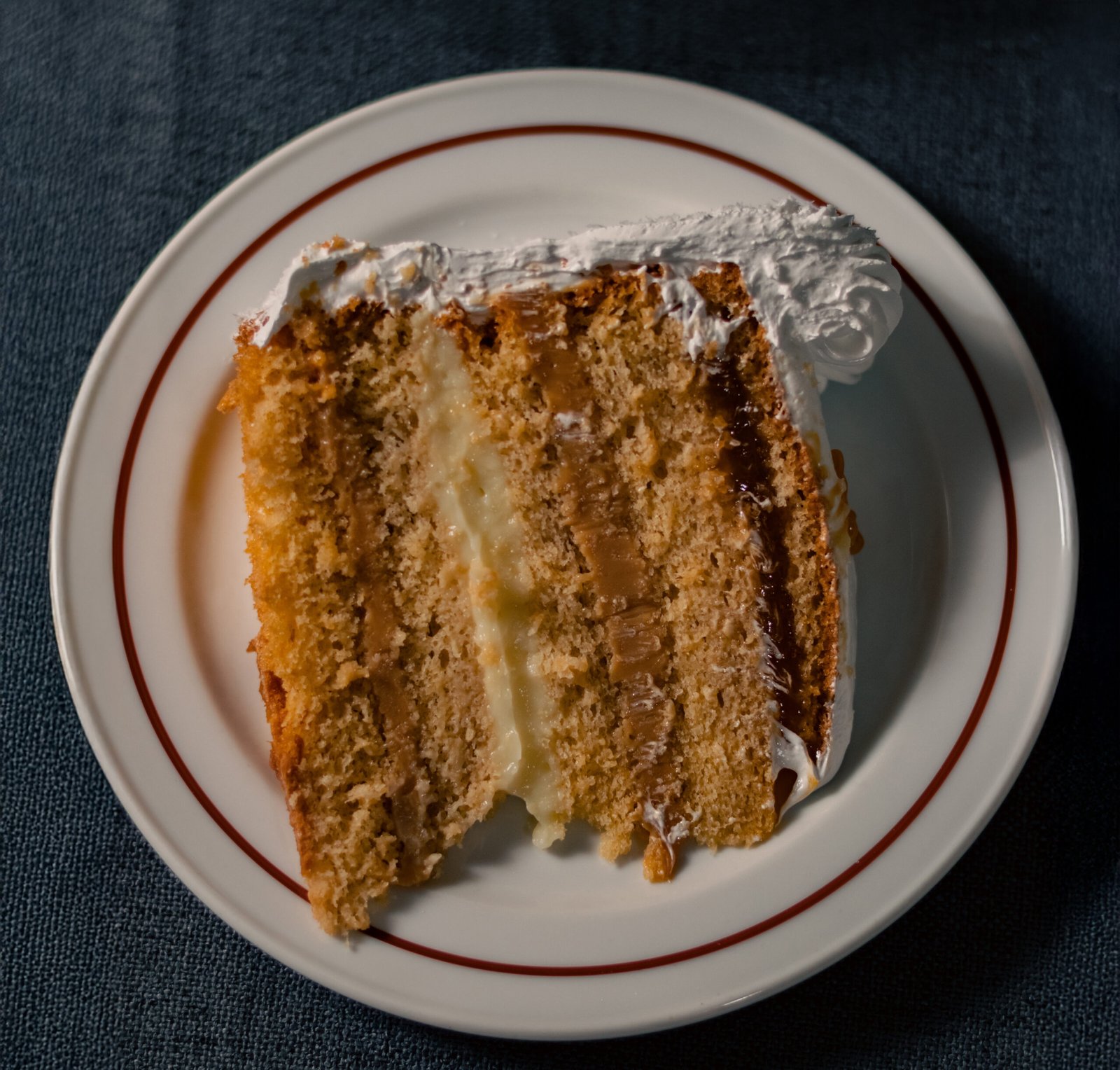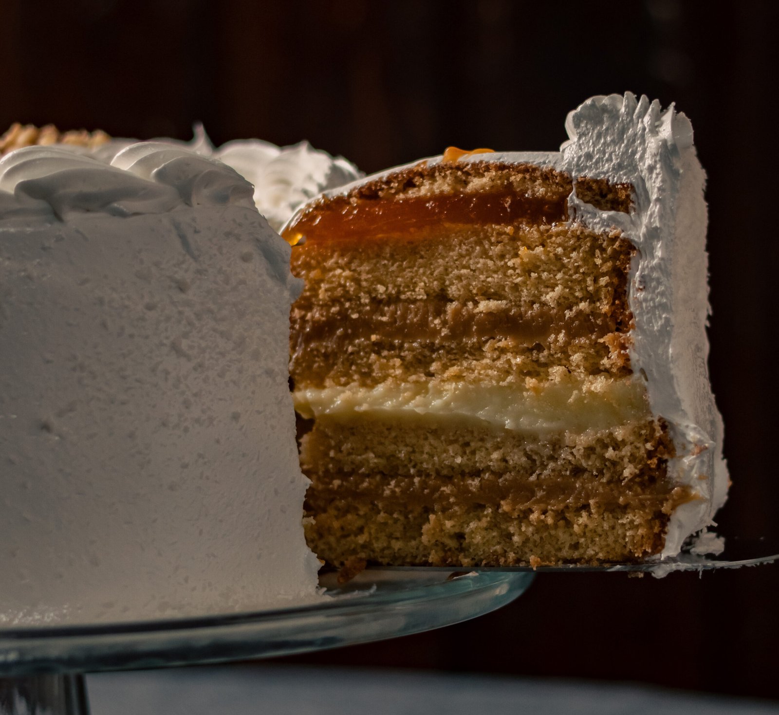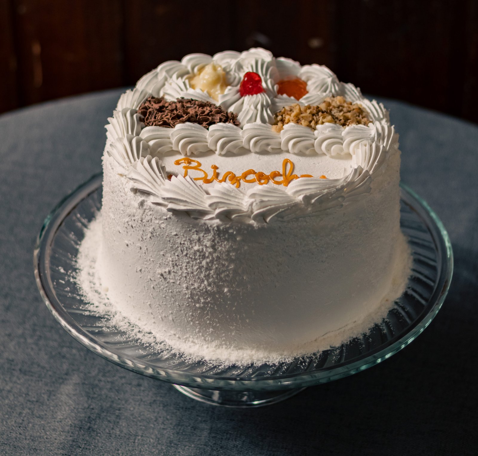 Queque de bizcoho blanco relleno de manjar, crema pastelera y mermelada de damascos. Cubierta de merengue italiano, coco rayado por el costado y decorada con chocolate y frutos secos picados.