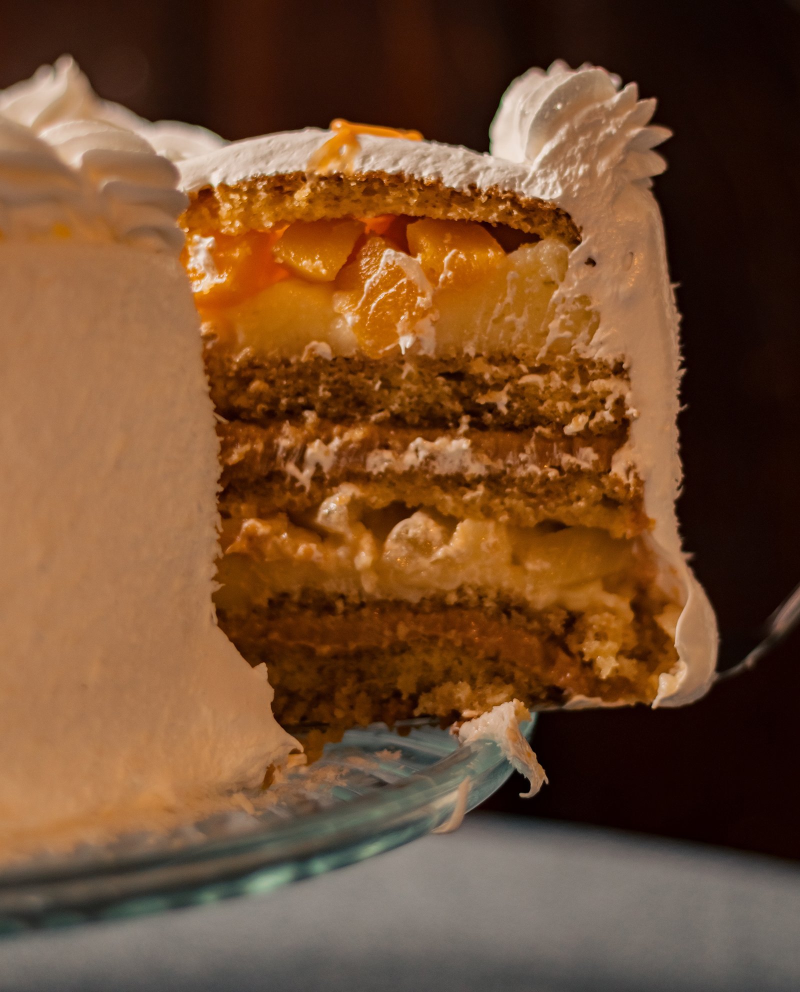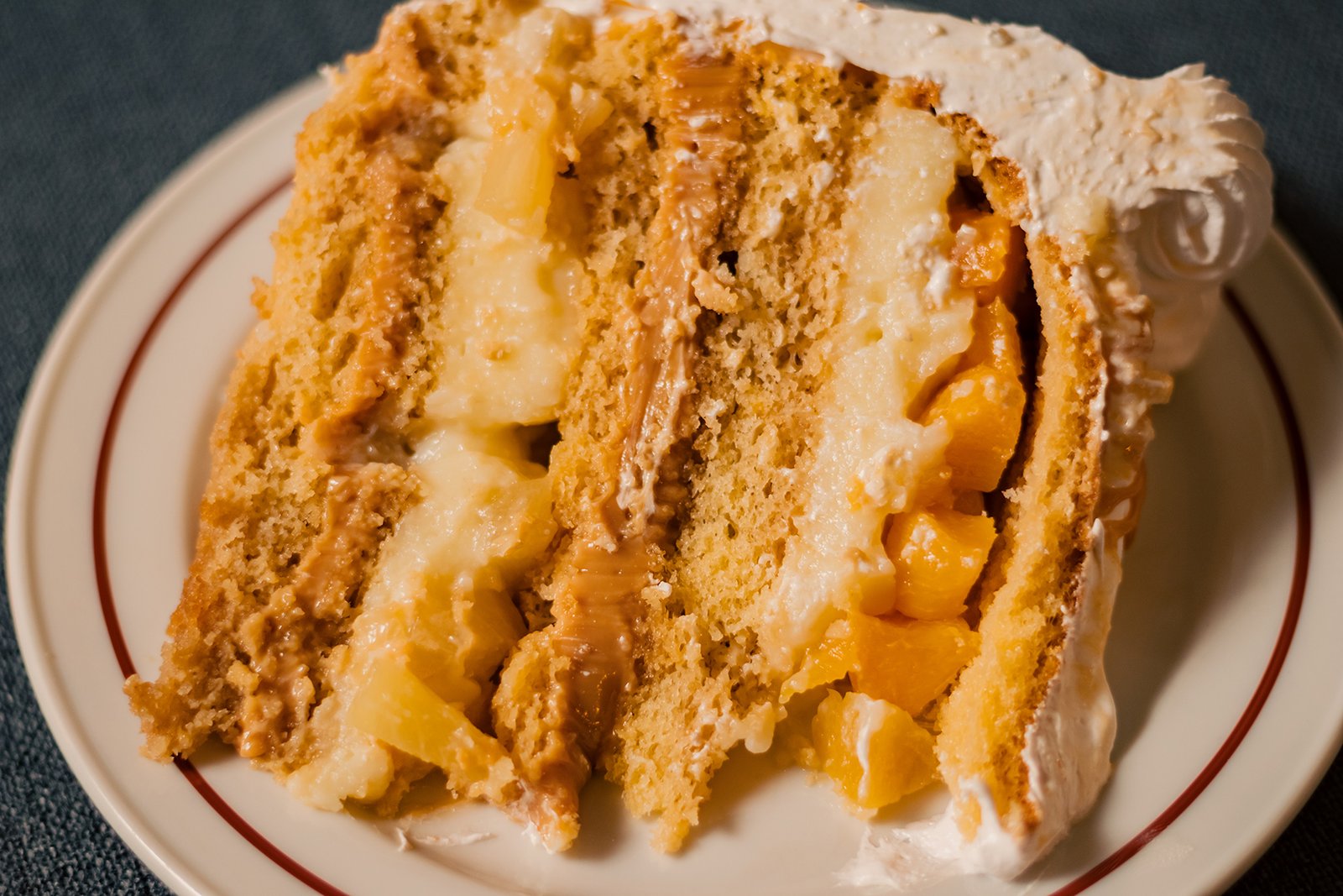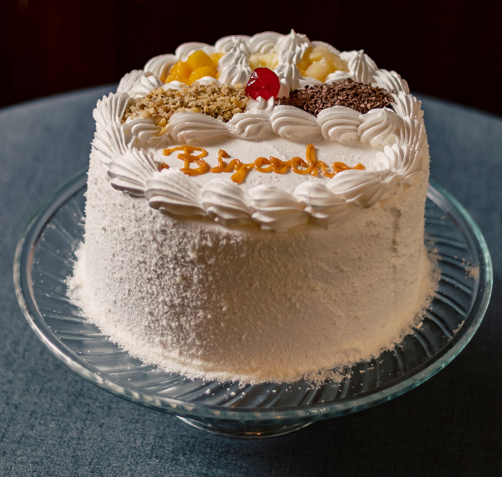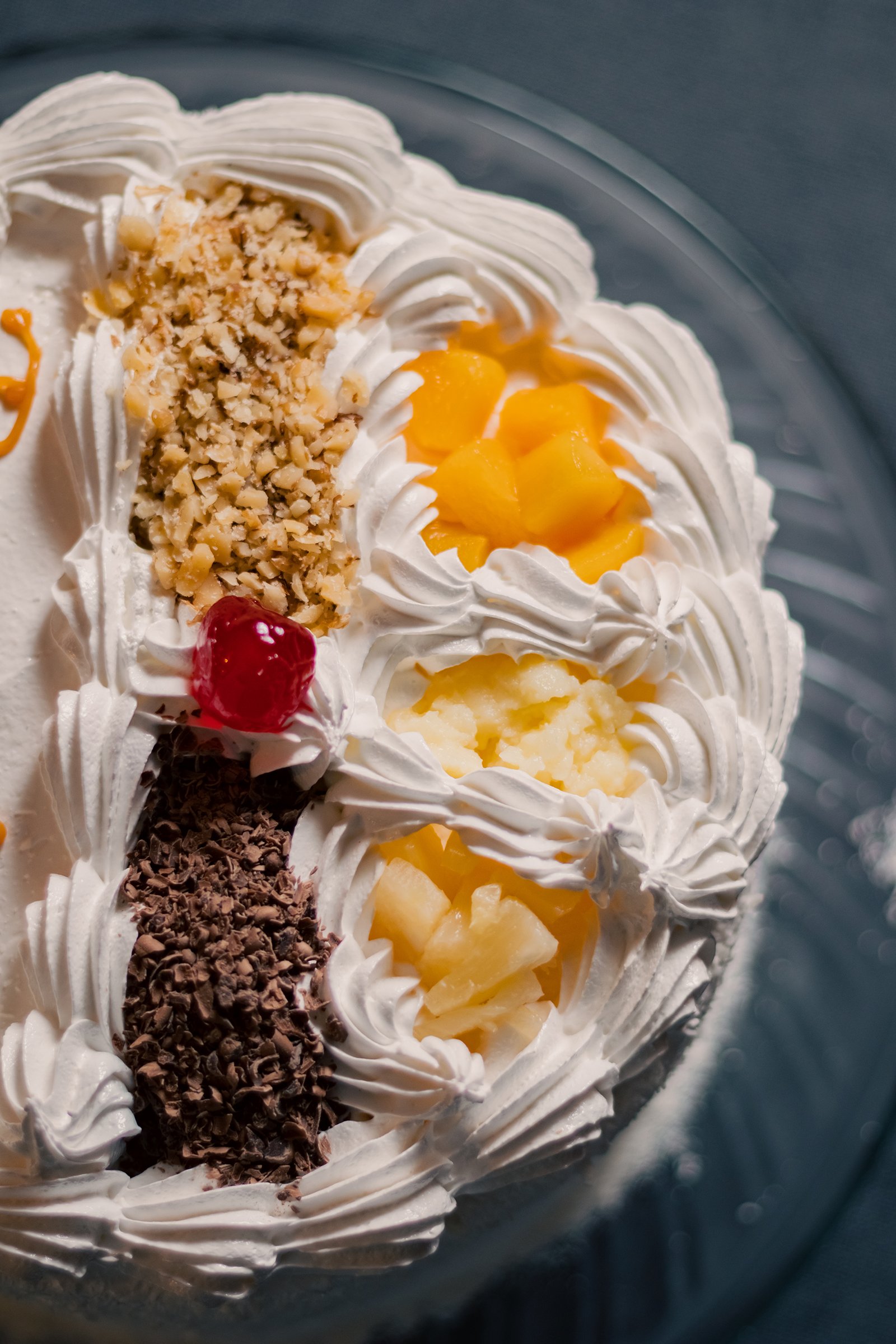 Queque de bizcoho blanco relleno de manjar y crema pastelera y trozos de piña y durazno. Cubierta de merengue italiano, coco rayado por el costado y decorada con chocolate y frutos secos picados.