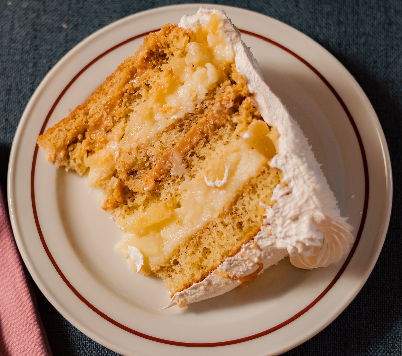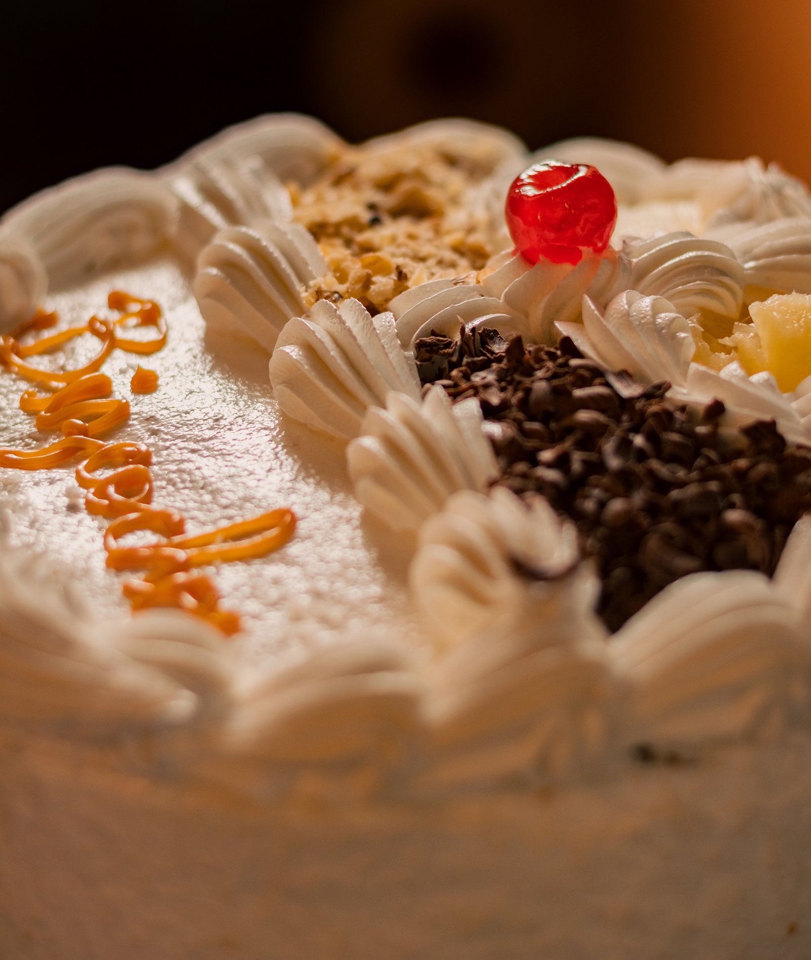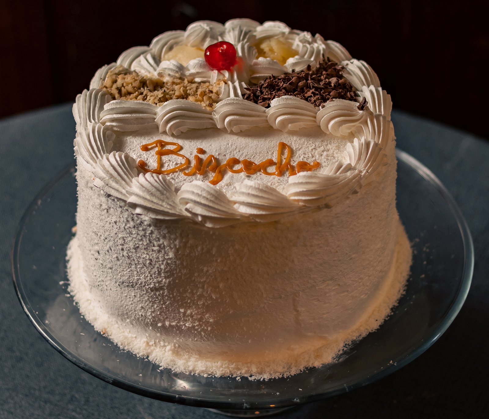 Queque de bizcoho blanco relleno de manjar y crema pastelera y trozos de piña. Cubierta de merengue italiano, coco rayado por el costado y decorada con chocolate y frutos secos picados.