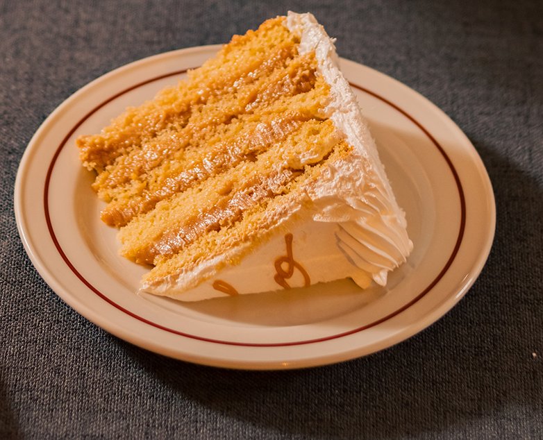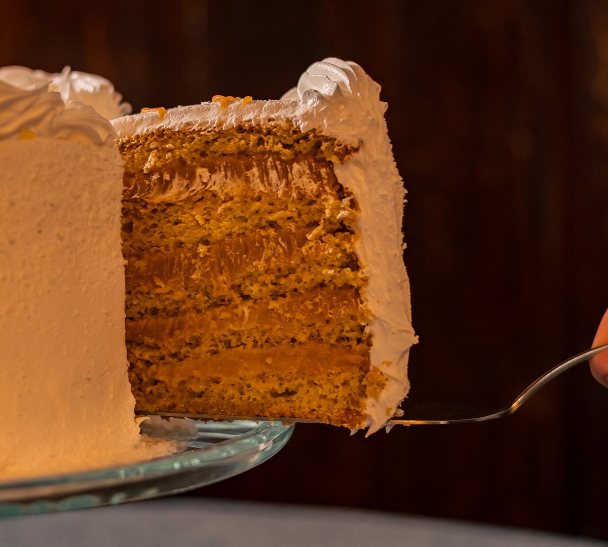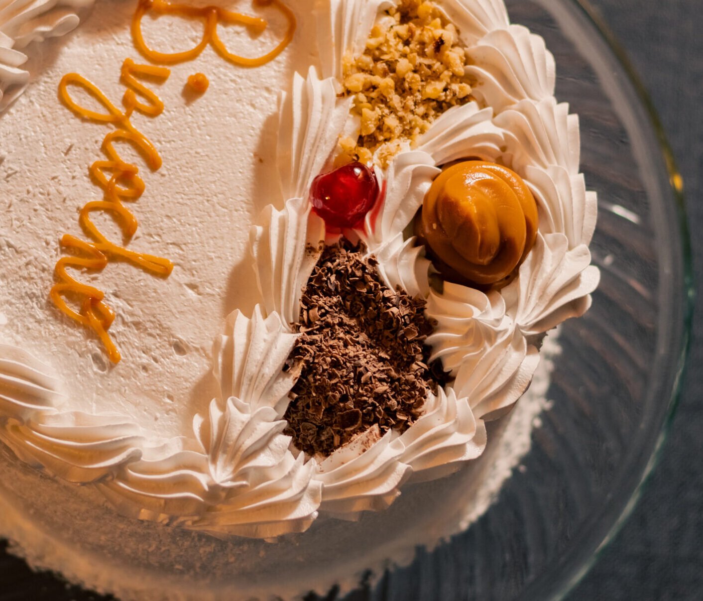 Queque de bizcoho blanco relleno de manjar. Cubierta de merengue italiano, coco rayado por el costado y decorada con chocolate y frutos secos picados.
