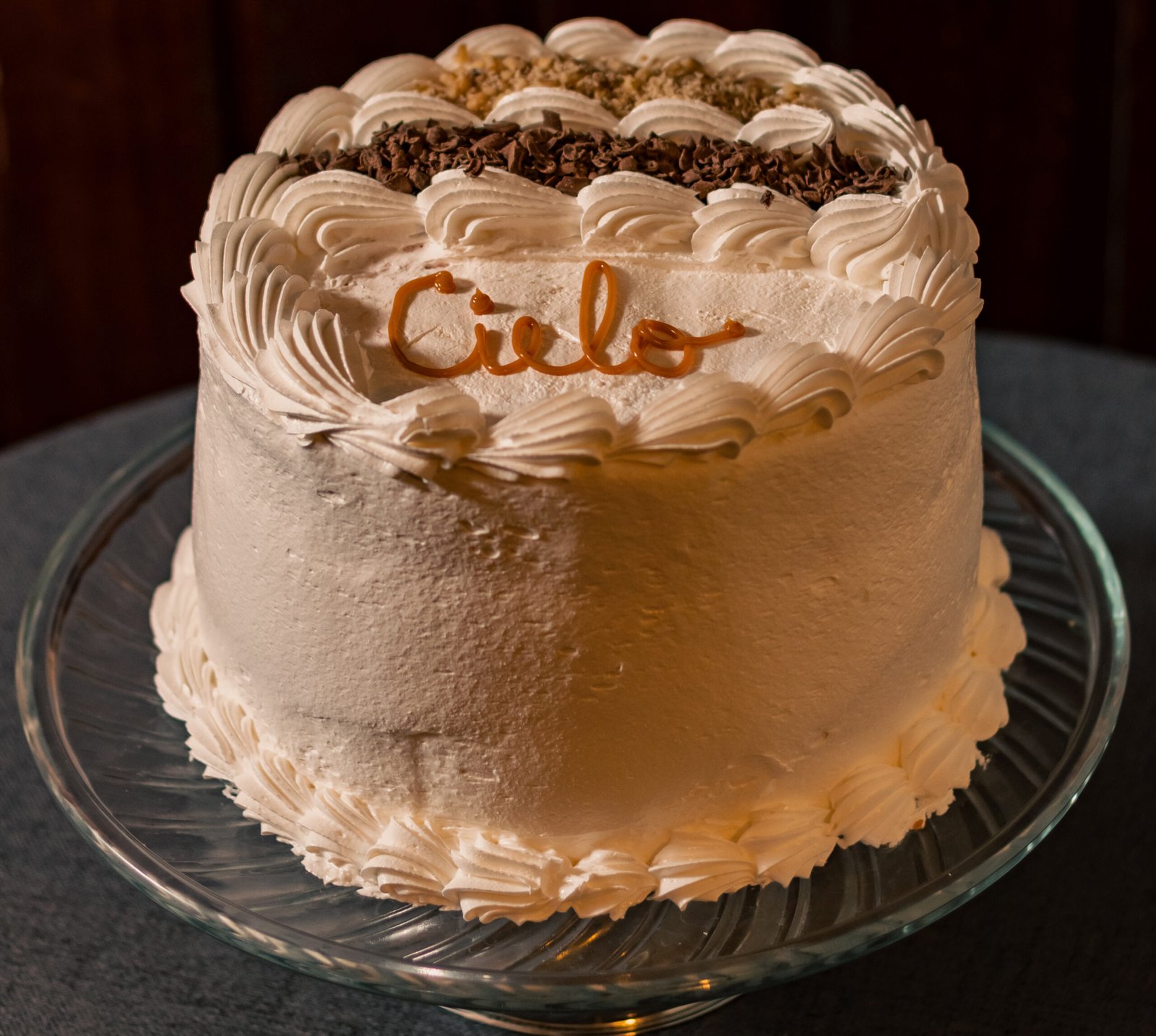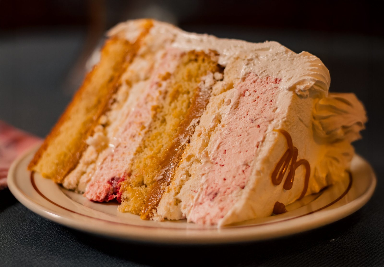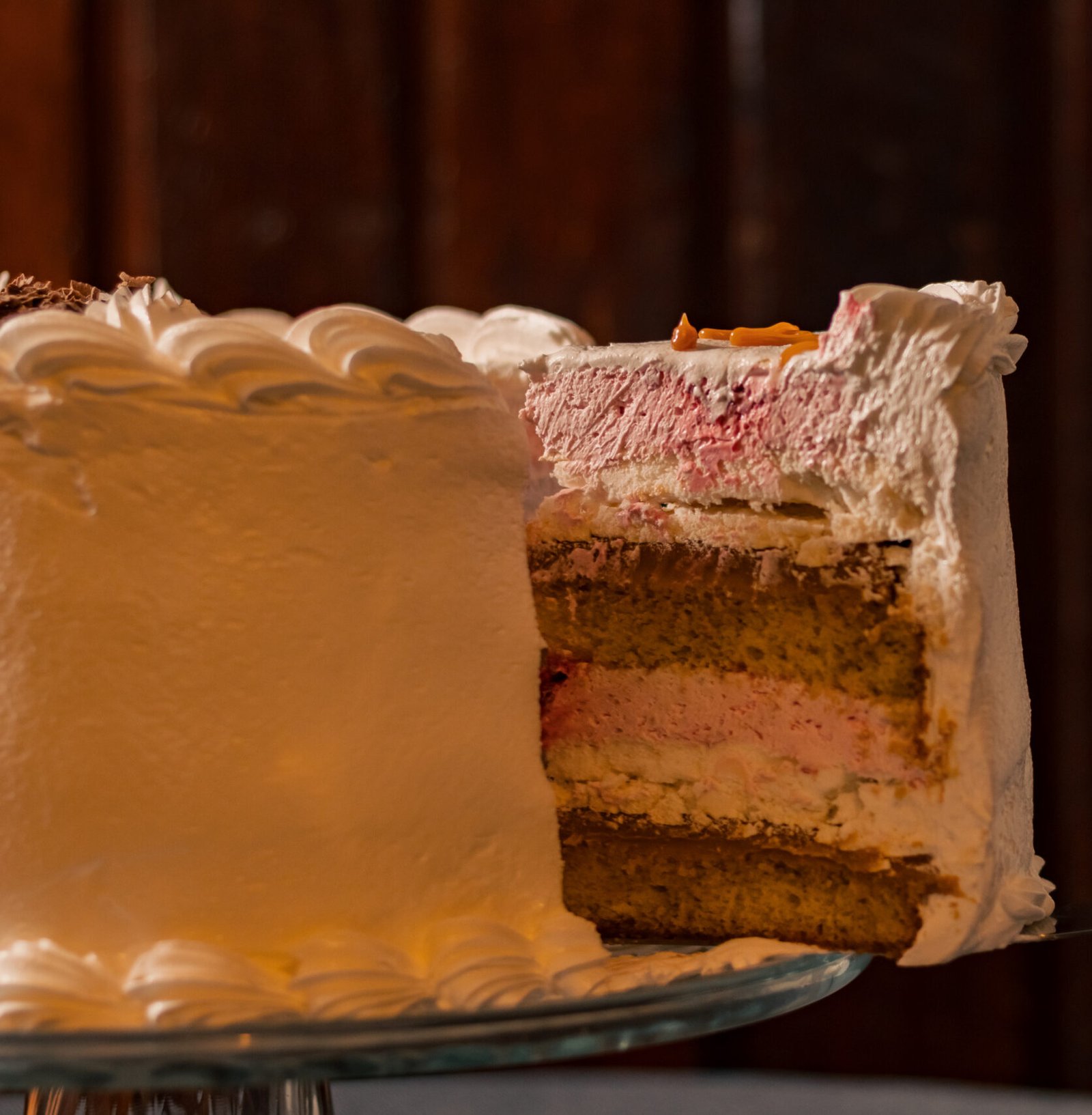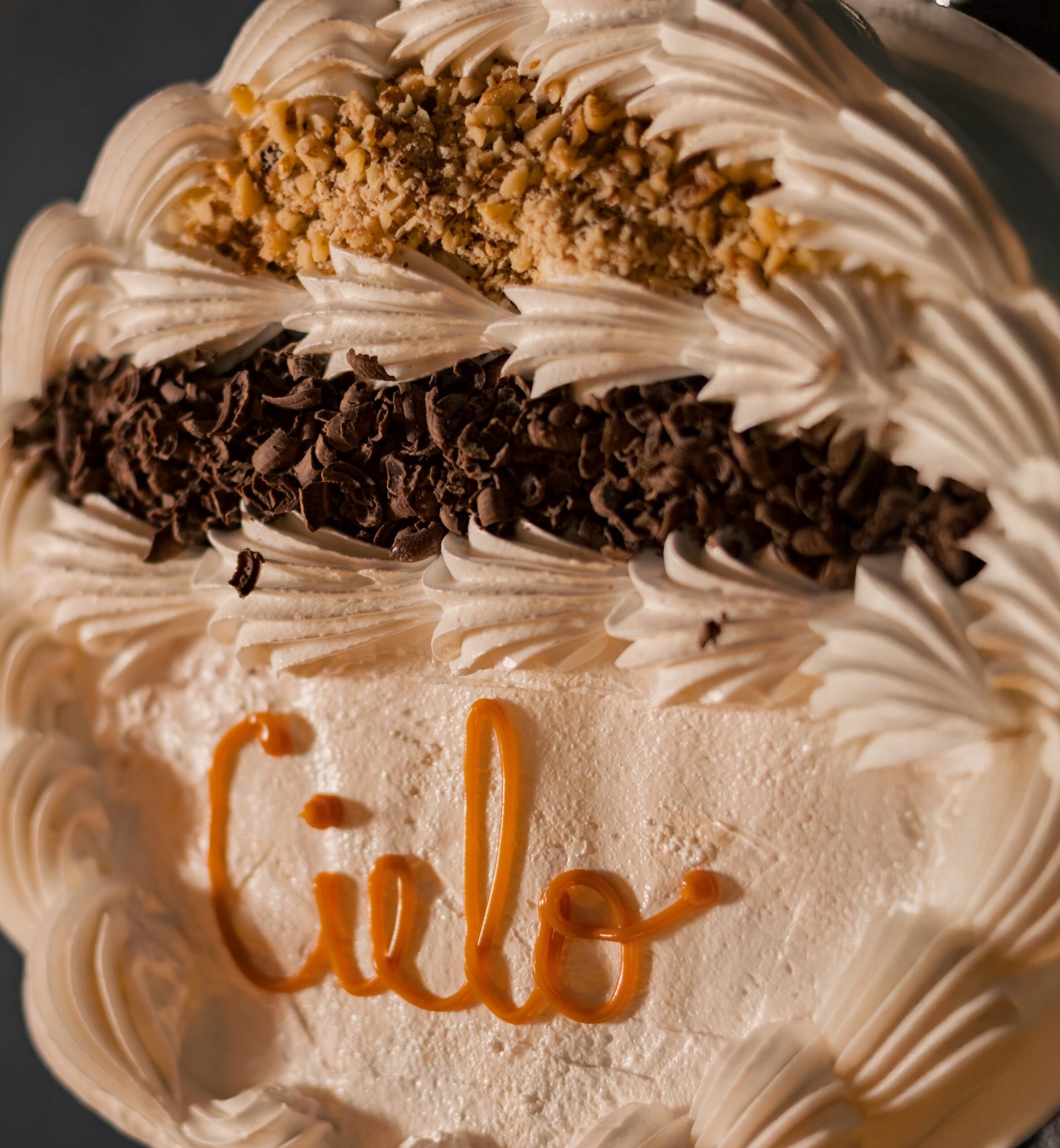 Queque de bizcocho blanco con discos de merengue. Su relleno consta de crema chantilly con frambuesas y manjar. Por fuera es decorada con merengue, chocolate y frutos secos picados.