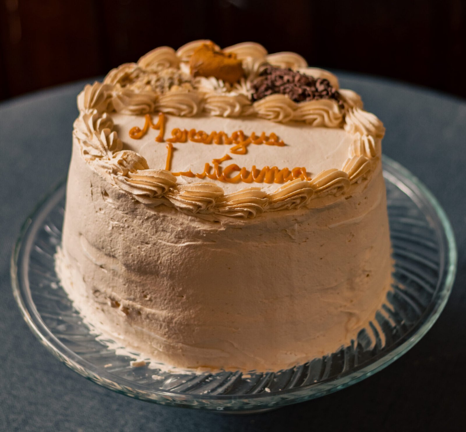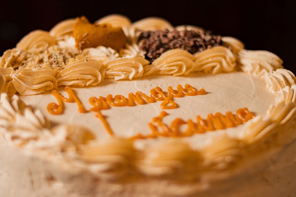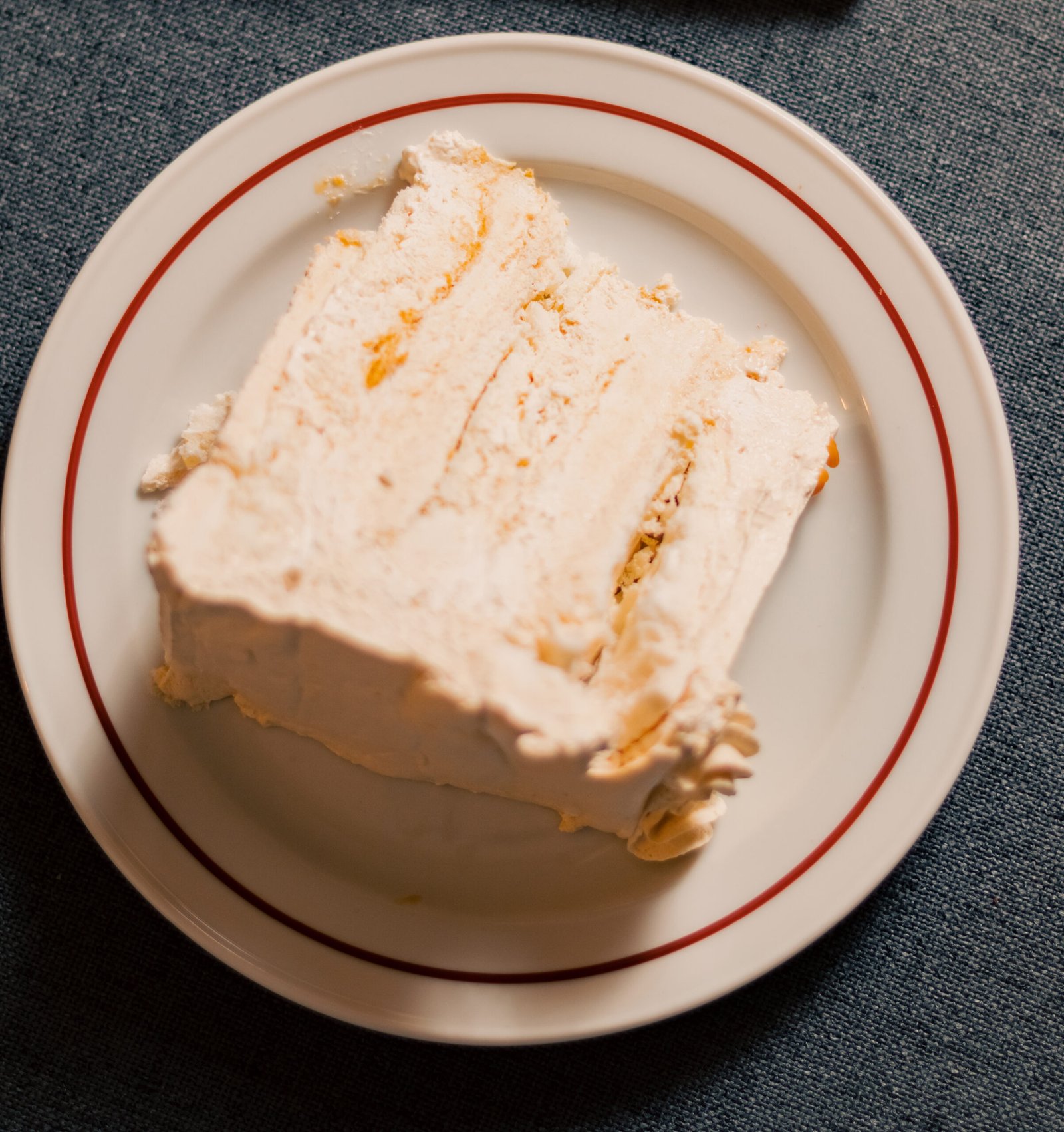 Discos de merengue rellenos con crema con puré de lúcuma. Cubierta de crema con lúcuma y decorada con chocolate y frutos secos picados. Torta congelada.