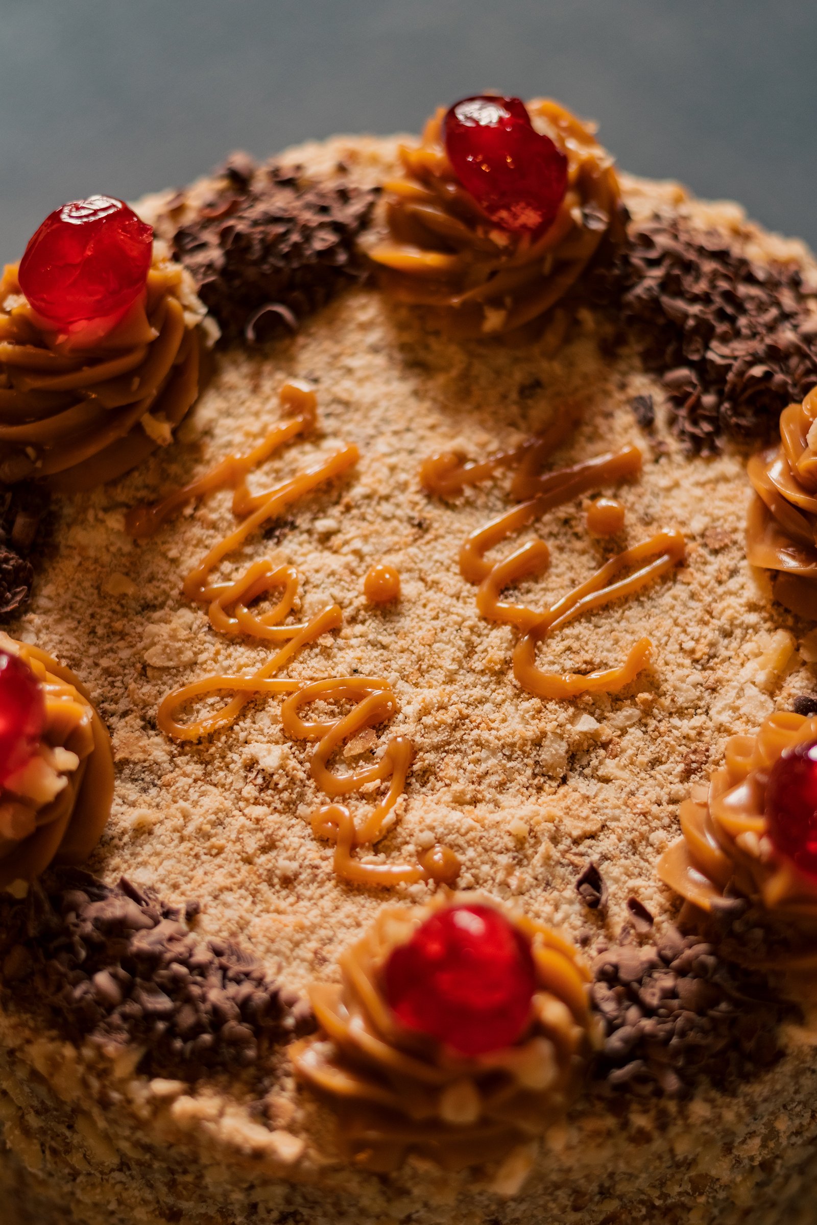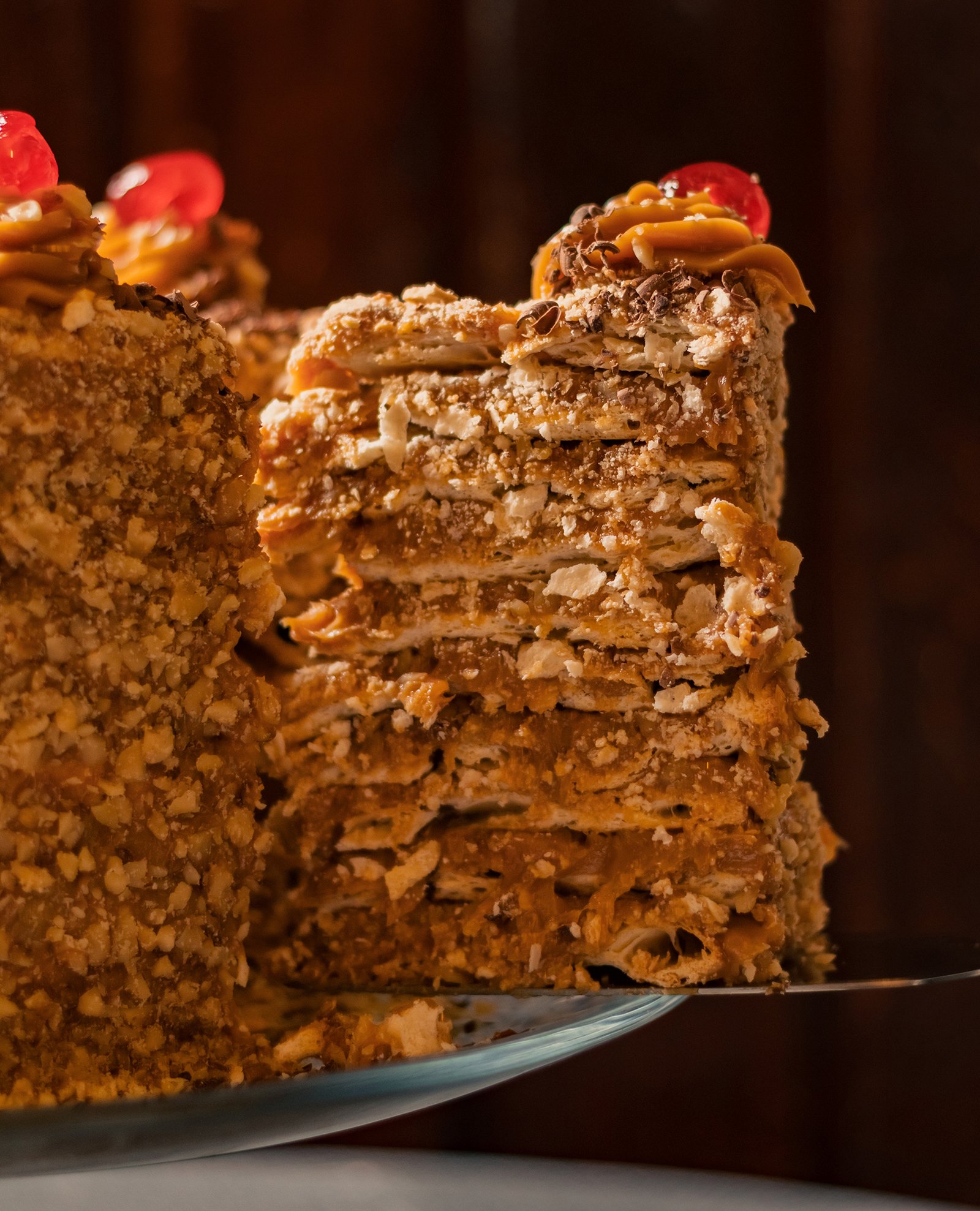 Hojarascas de mil hojas rellenas de manjar y nueces picadas. Cubierta con manjar, nueces picadas y migas de mil hojas, decorada con chocolate picado y guindas.
