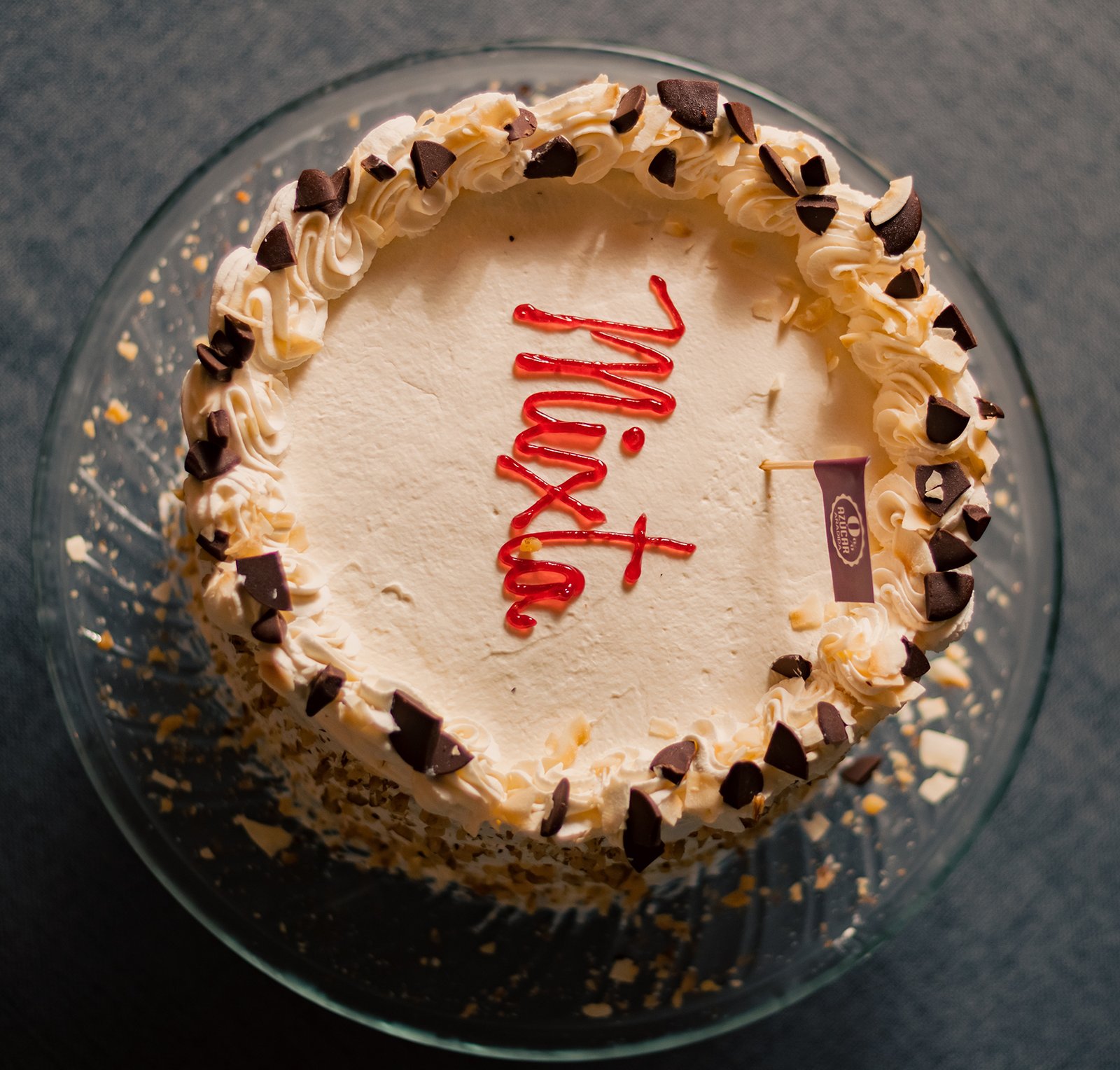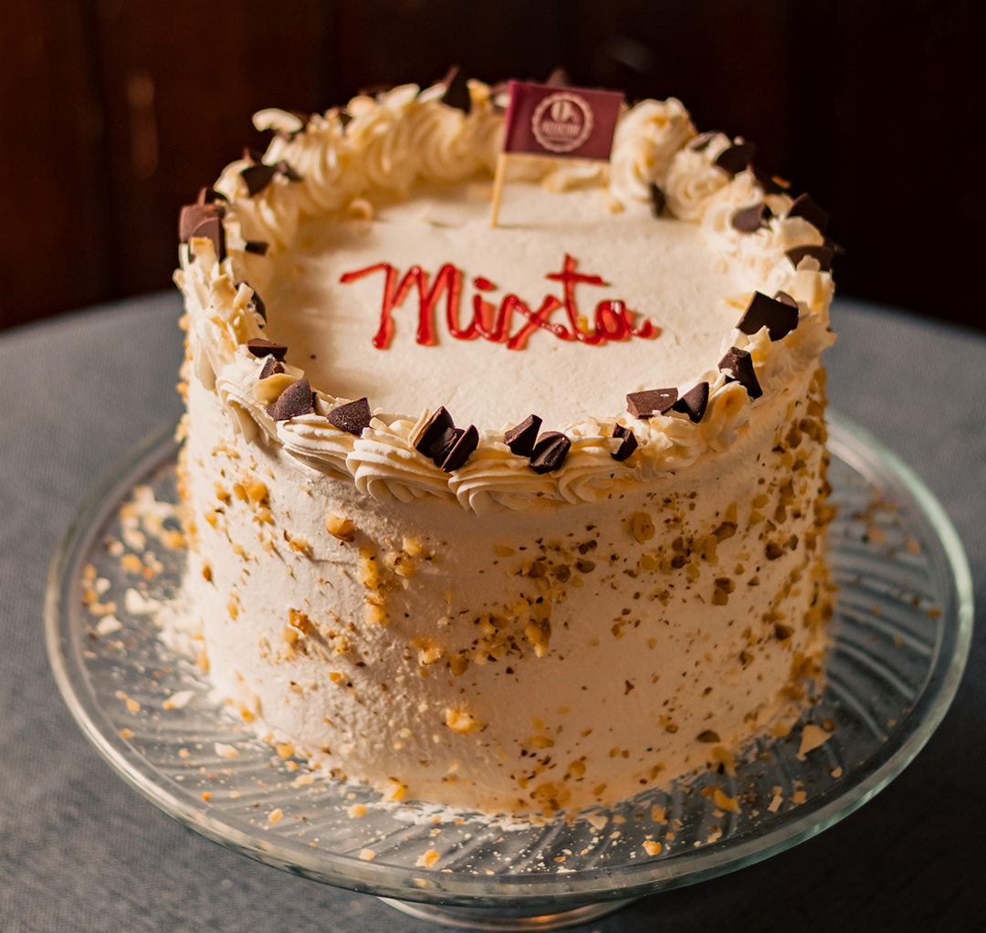 Bizcochos de chocolate y blanco de fabricacion propia, endulzado con alulosa, rellano con manjar sin azucar, mermelada de frambuesa sin azúcar y crema pastelera sin azúcar. Por fuera es cubierta con crema chantillí, nueces picadas por el costado, decorada con coco en laminas y chocolate sin azúcar en trozos. Cabe destacar que este producto es libre de azucar refinada pero contiene carbohidratos.