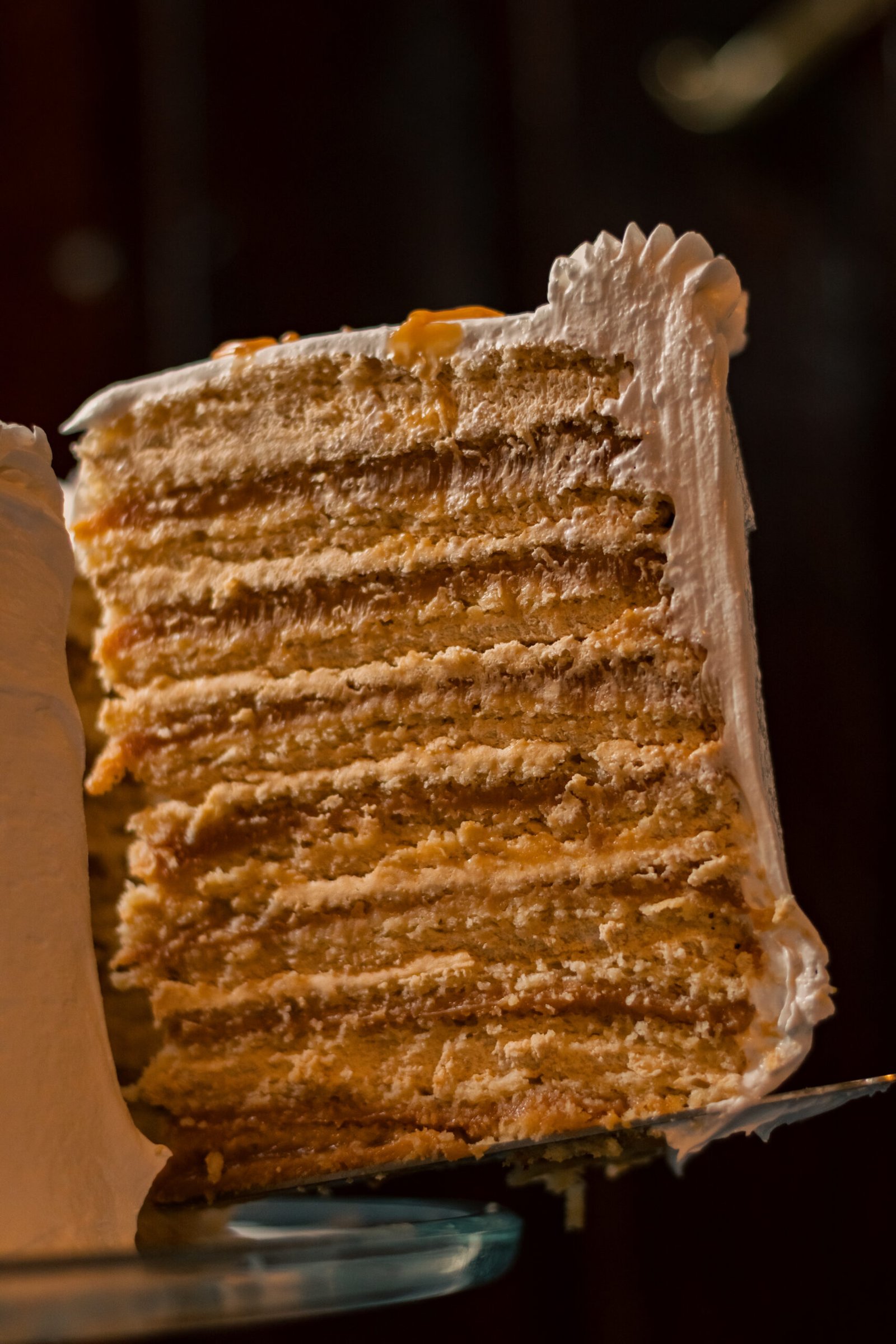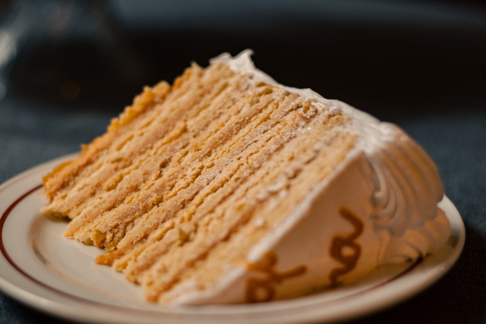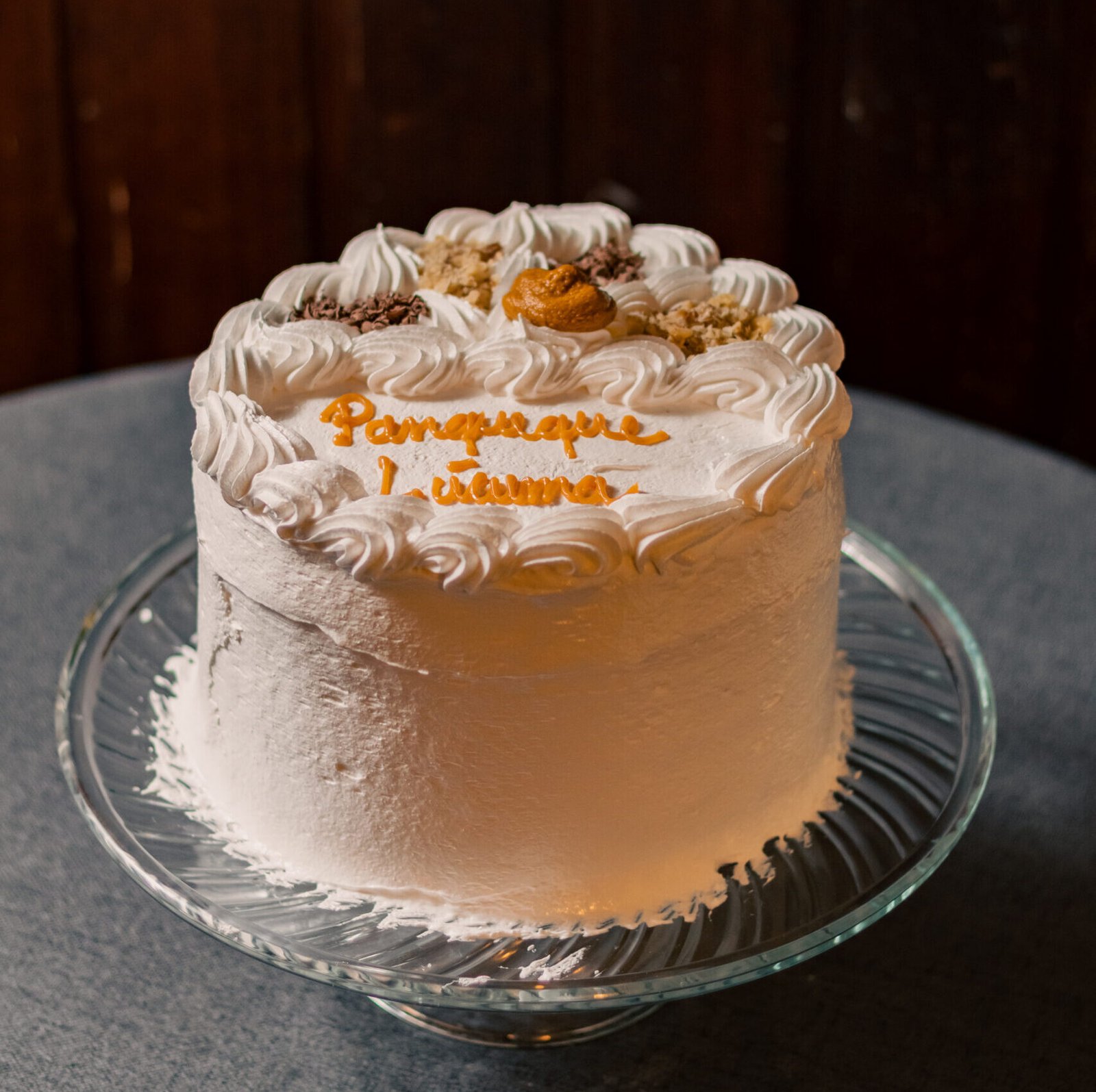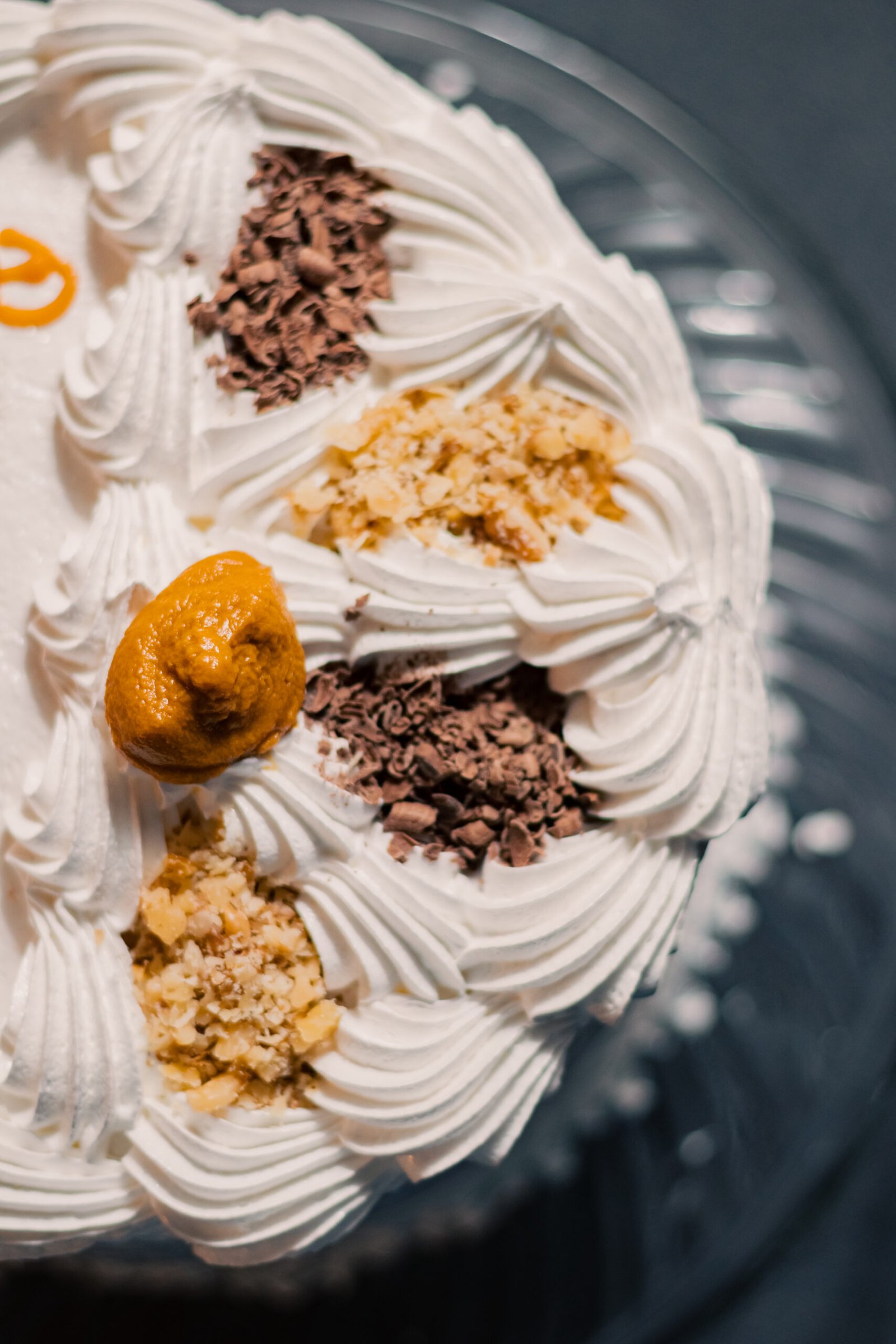 Panqueques blancos rellenos de manjar, crema chantillí con puré de lúcuma. Cubierta de merengue italiano y decorada con chocolate y frutos secos picados.