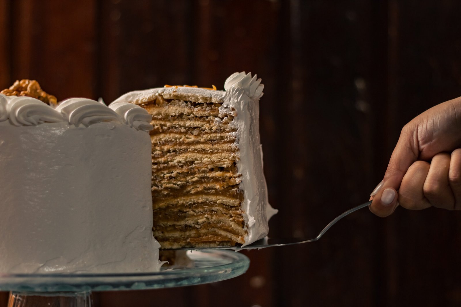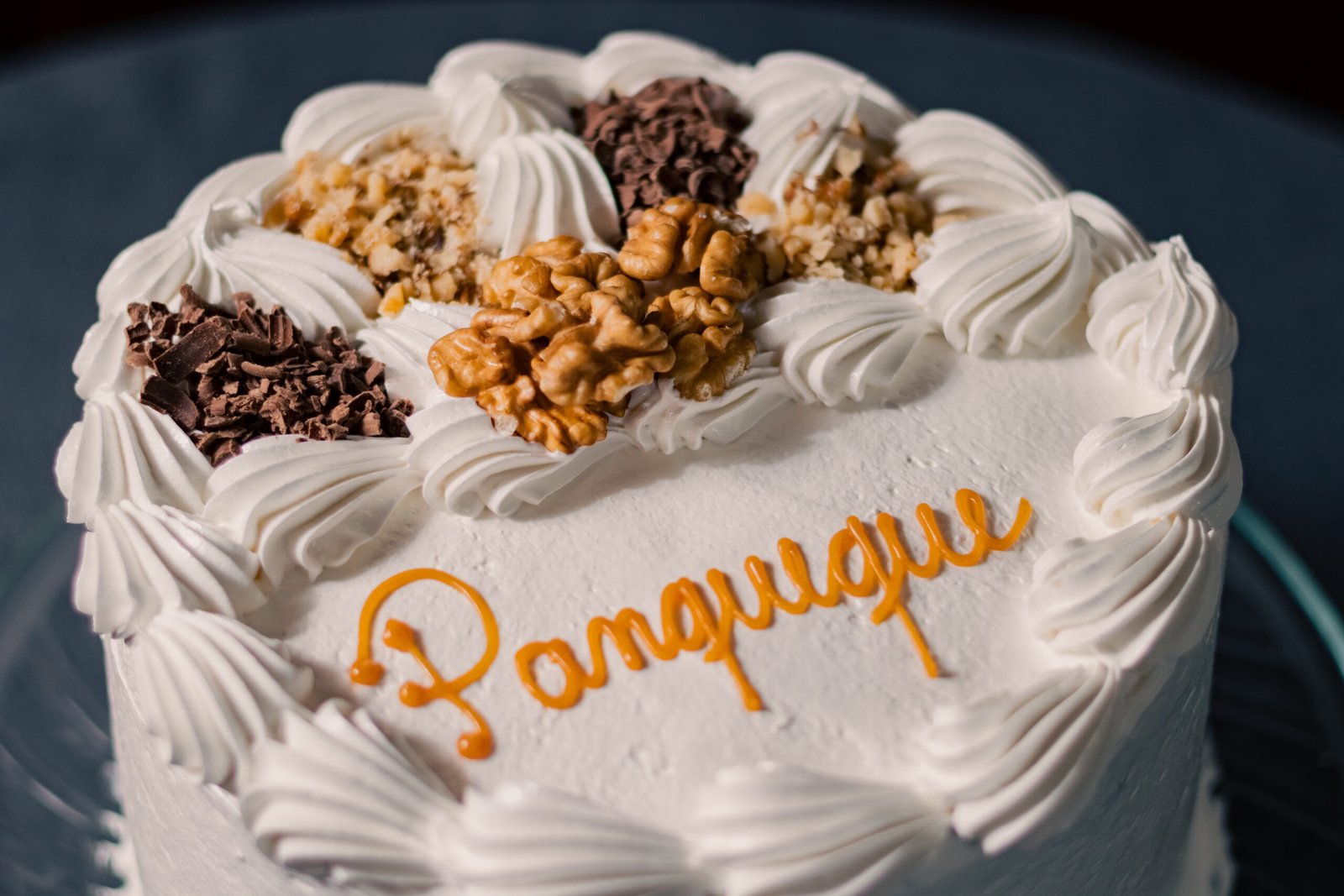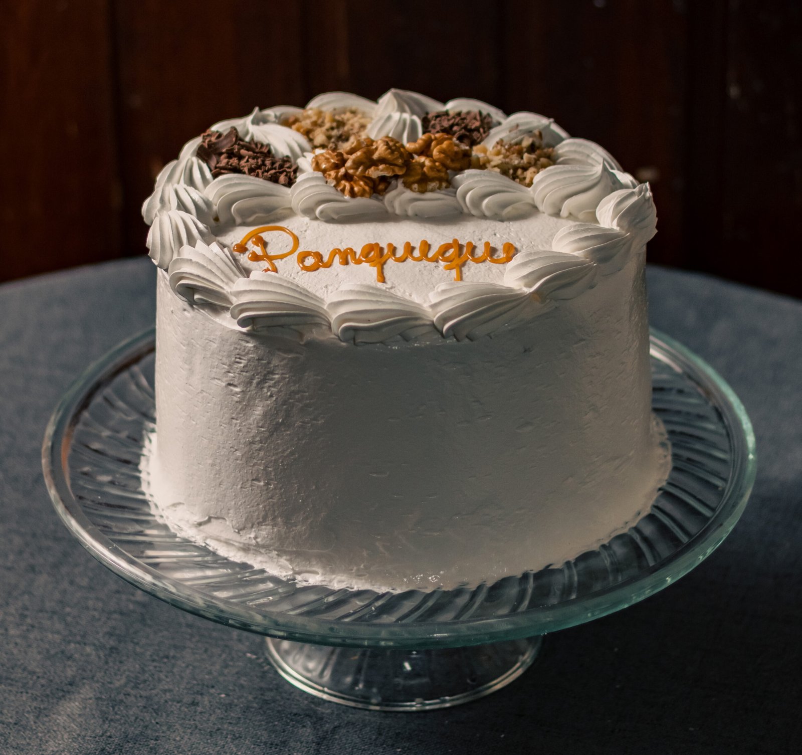 Panqueques blancos rellenos con manjar y nueces picadas. Cubierta de merengue italiano y decorada con chocolate y frutos secos picados.
