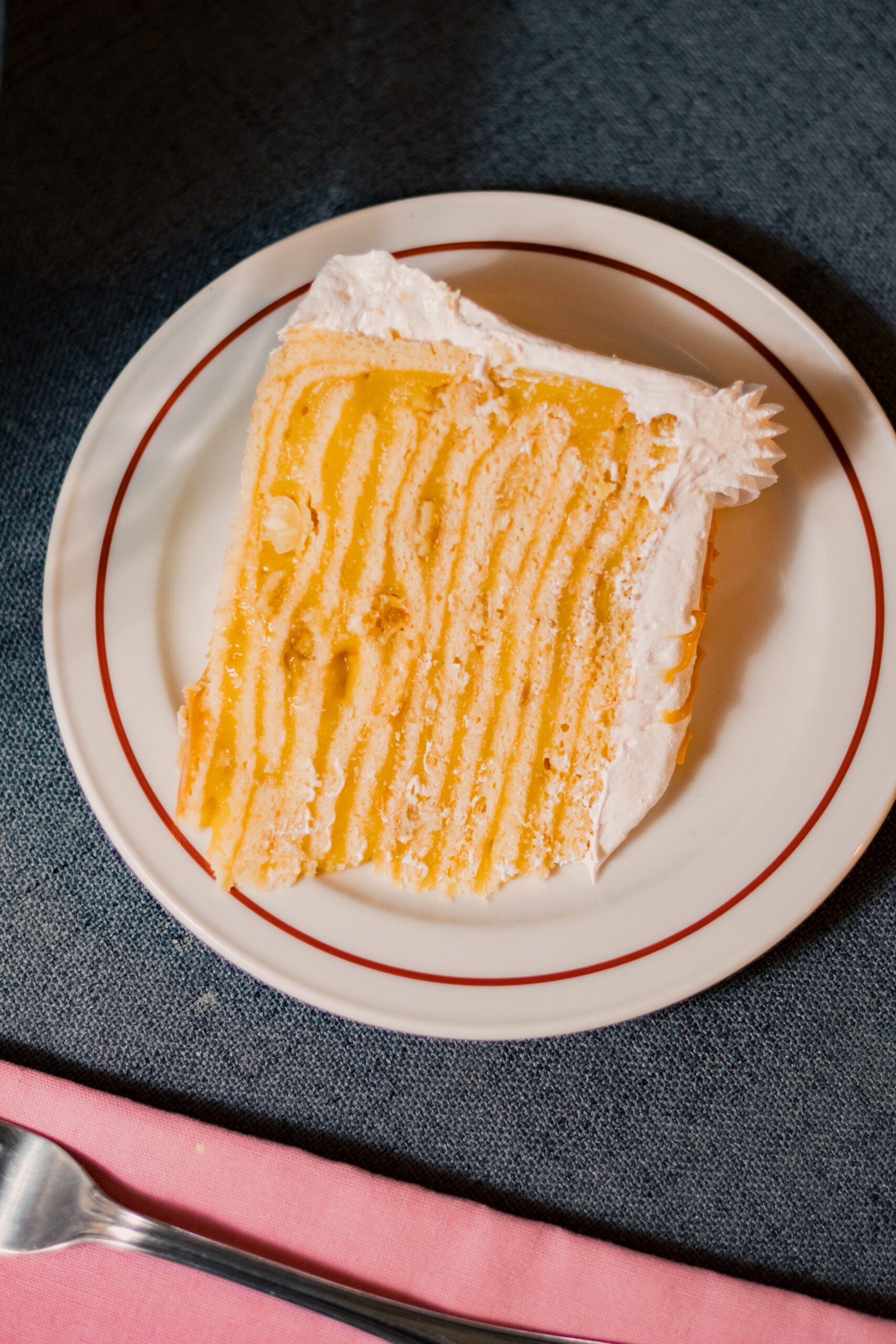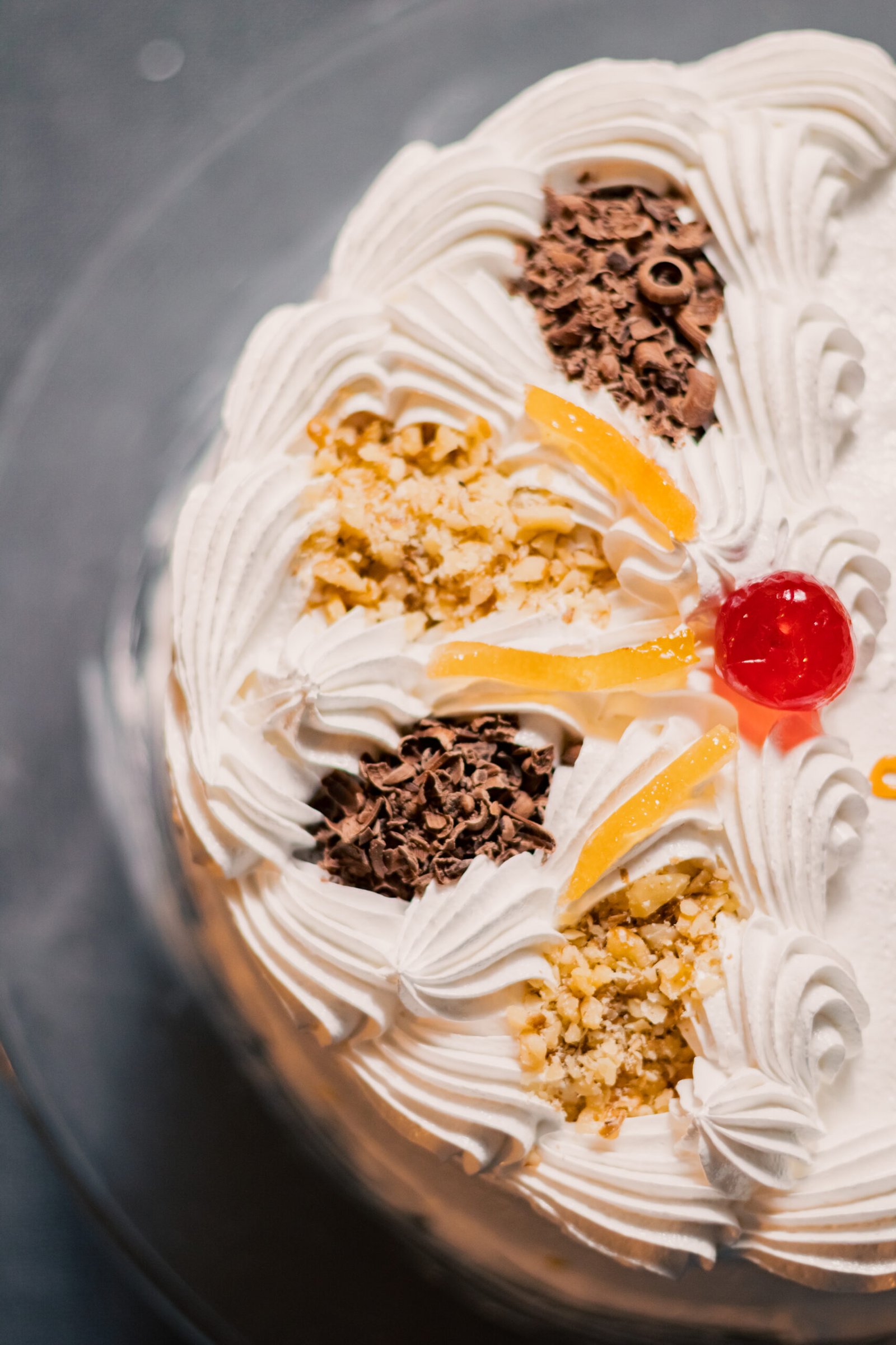Panqueques blancos rellenos de naranja con trocitos de naranja y alemndras picadas. Cubierta de merengue italiano y decorada con naranjitas confitadas, chocolate y frutos secos picados.