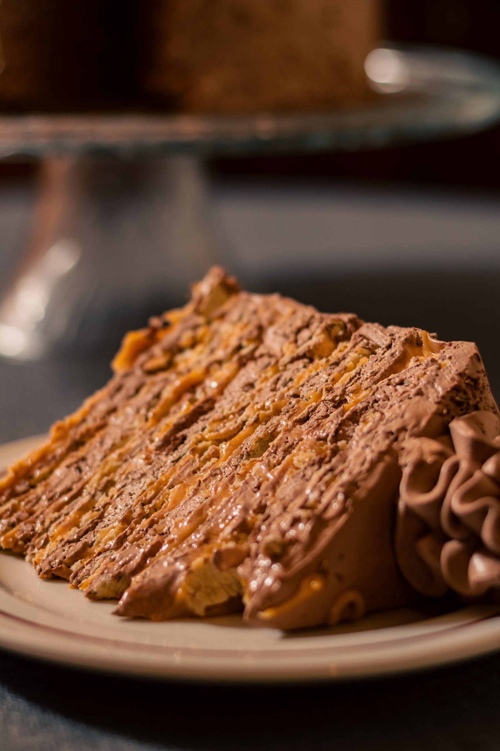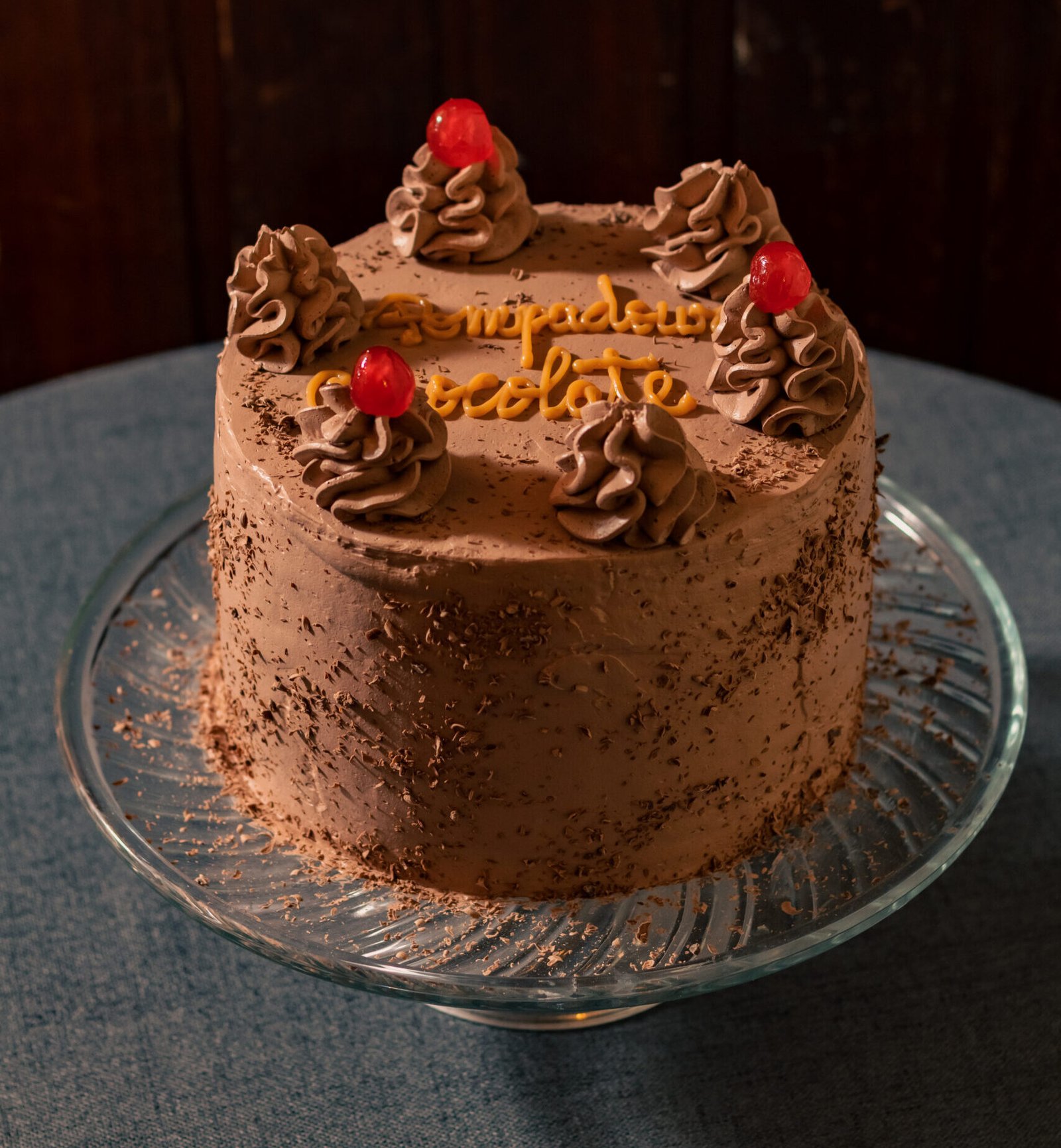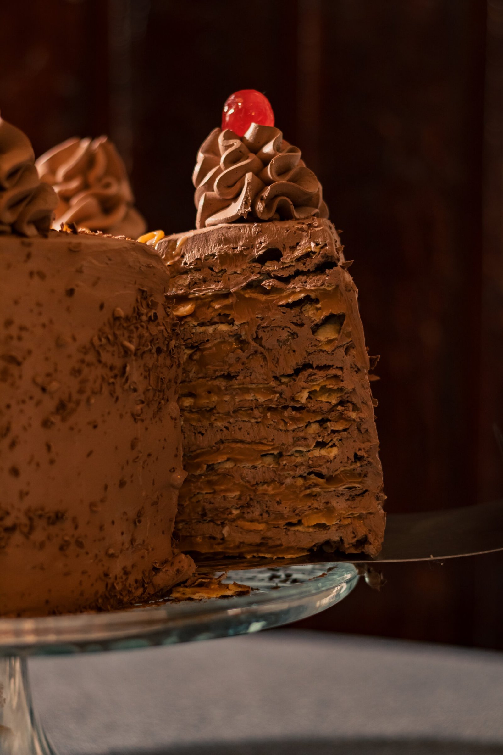 Delgadas hojas rellenas con manjar suavizado y crema chantilí de chocolate. Cubierta con crema chantillí de chocolate, migas de hojas y decorada con guindas y chocolate picado.