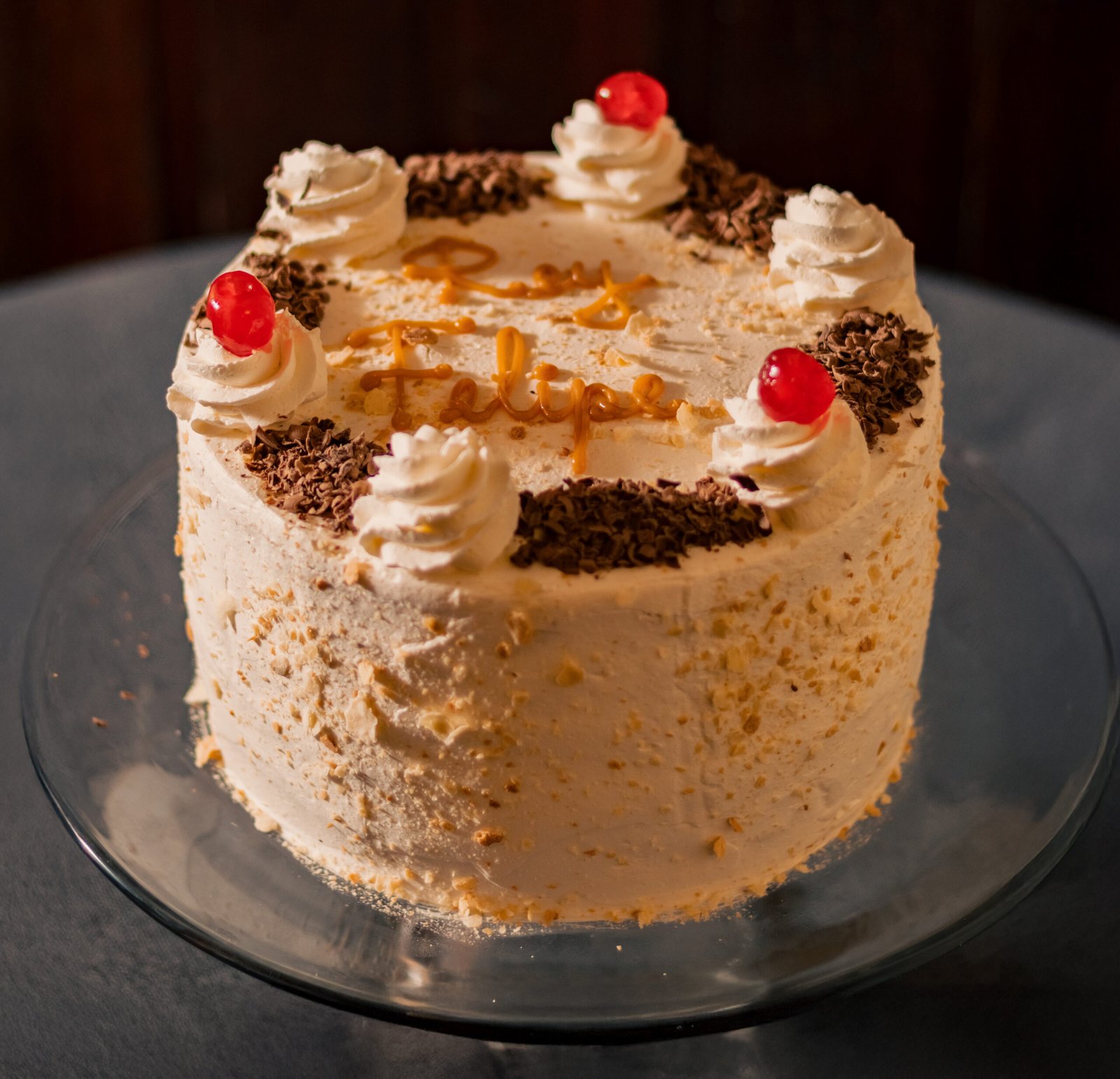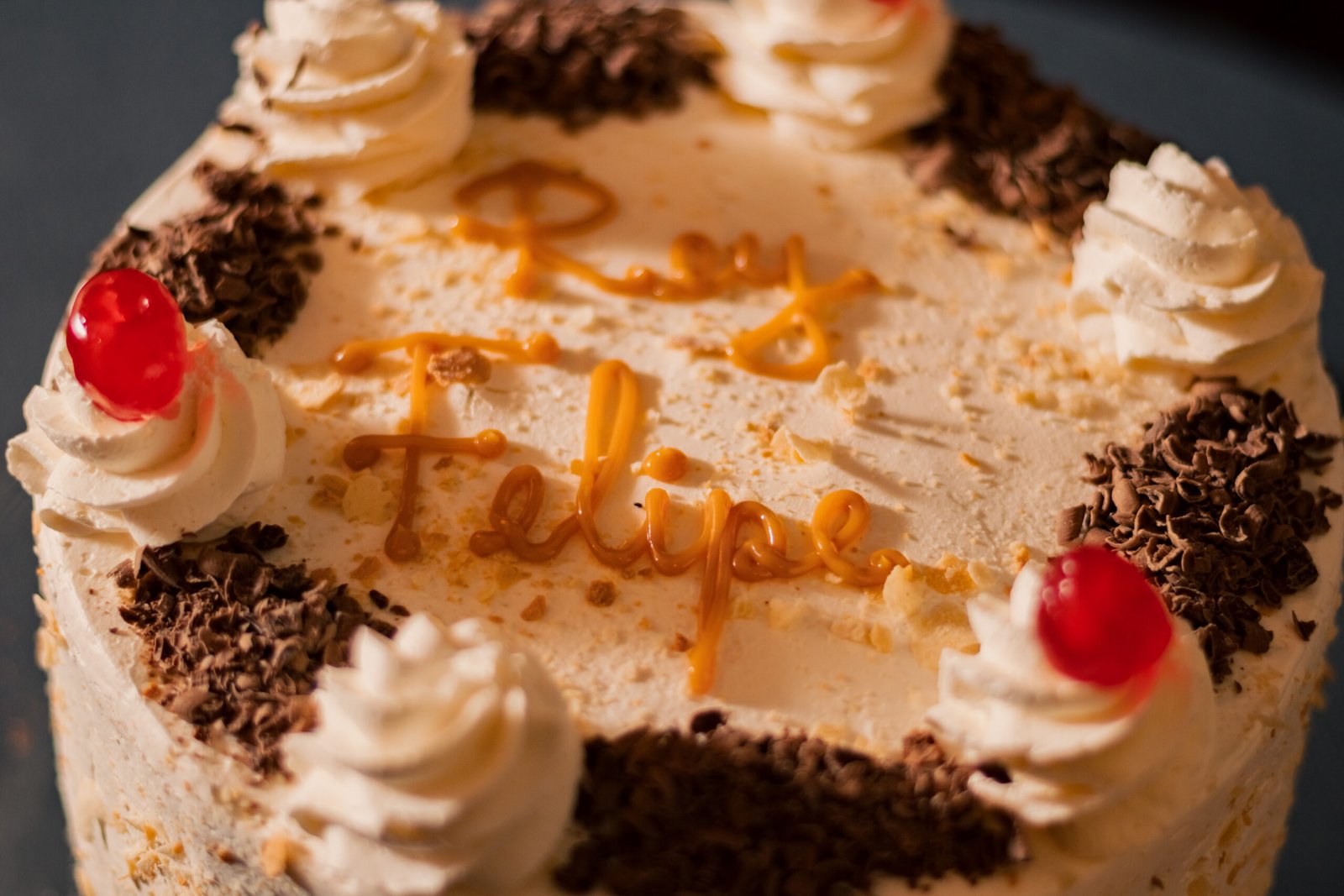 Por fuera es decorada con crema chantilly sabor plátano, migas de hojas, guindas y chocolate picado.