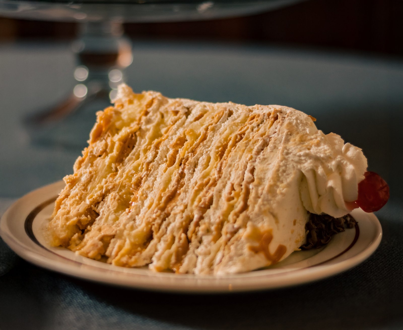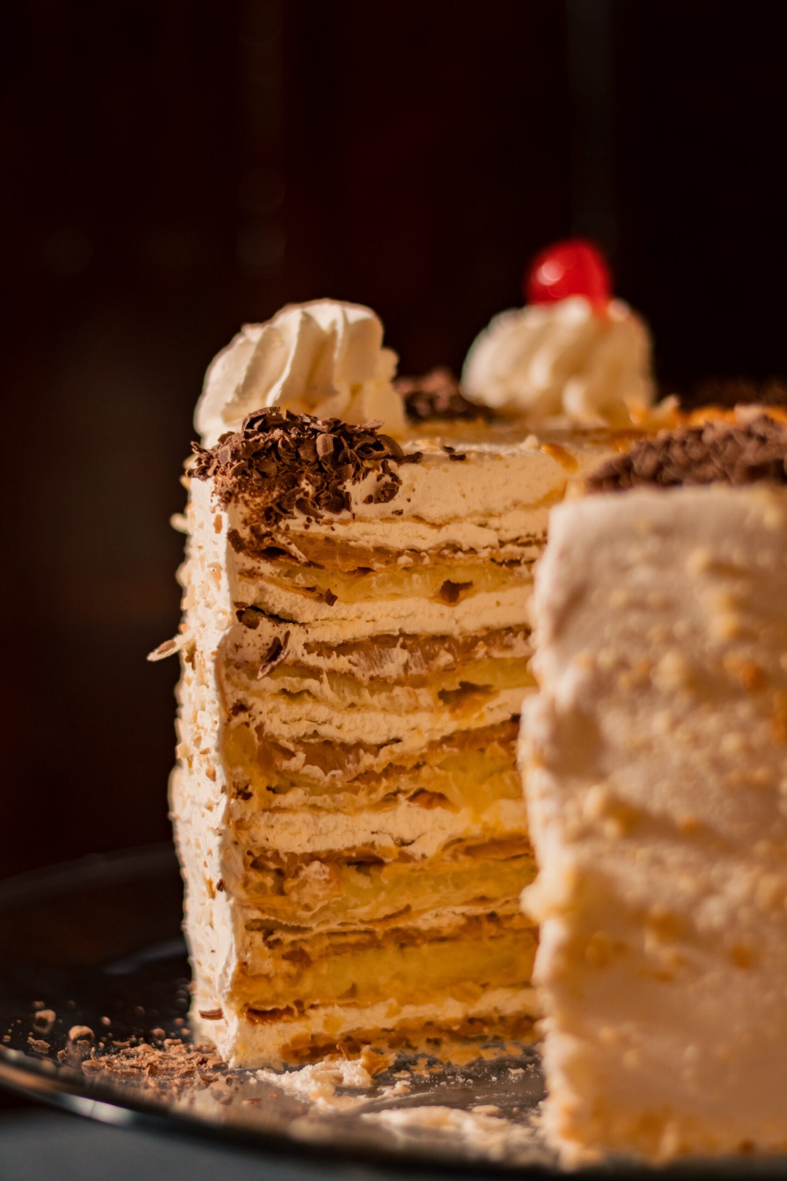 Delgadísimas hojarascas. Rellenas de crema chantilly con sabor a plátano, manjar suavizado y crema pastelera.