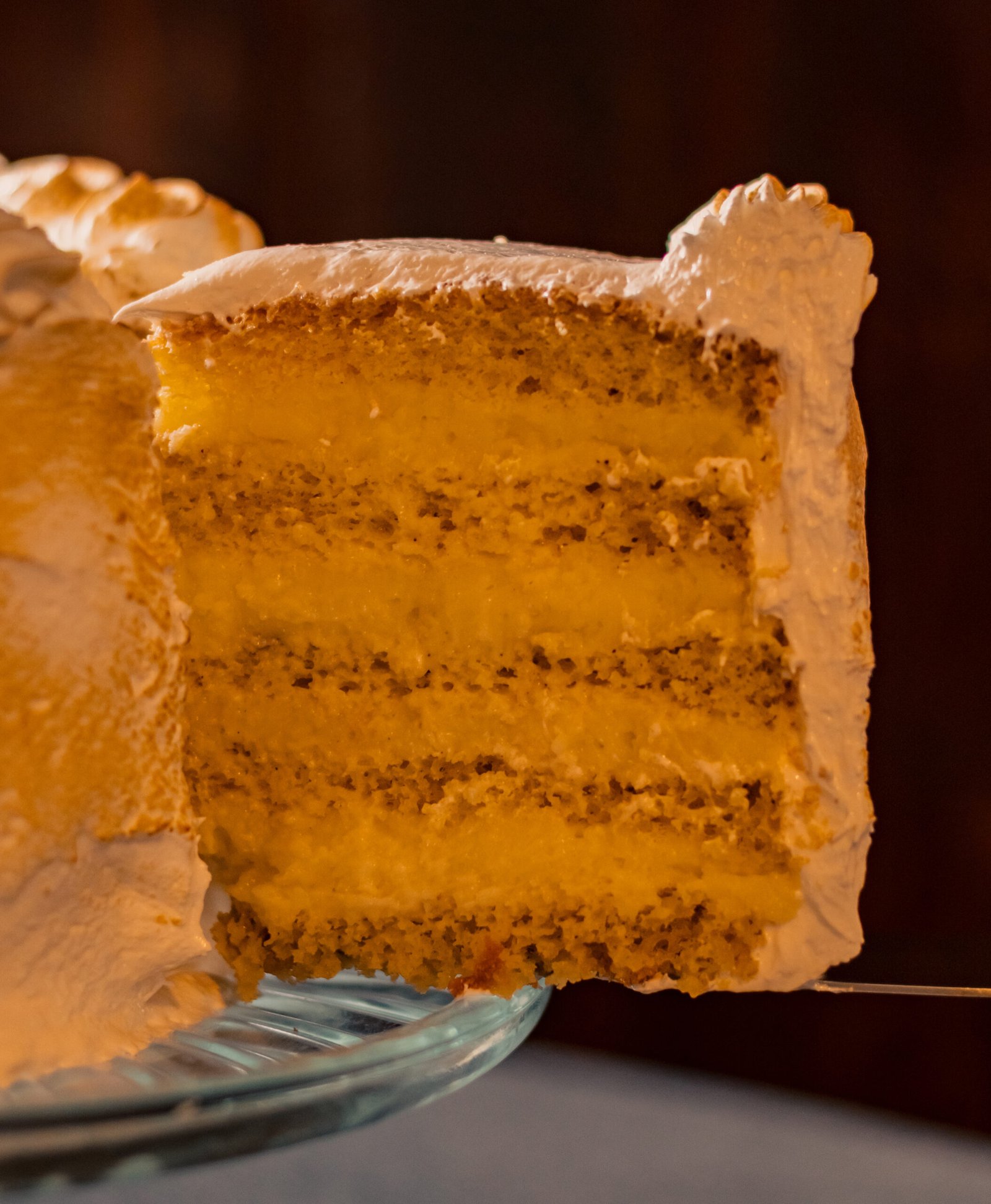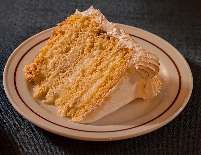 Queque de bizcoho blanco con remojo de tres leches y relleno de crema pastelera. Cubierta de merengue italiano flameado. Se puede adicionar manjar a su relleno